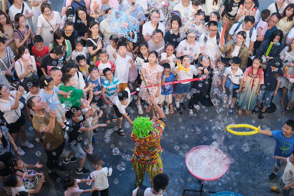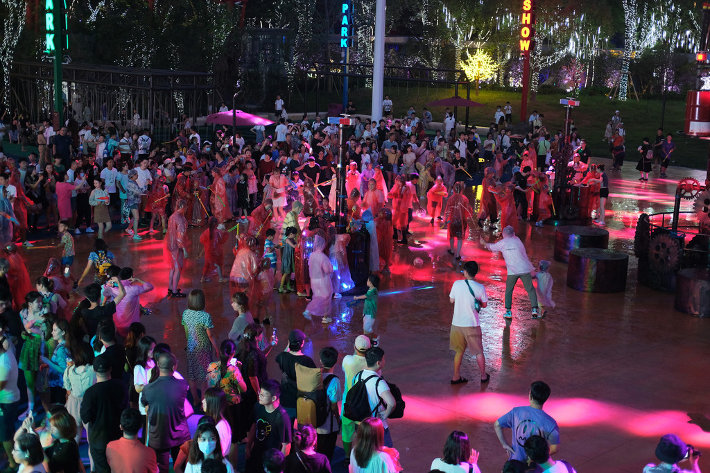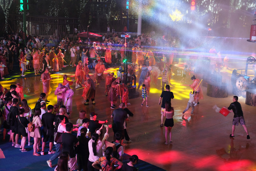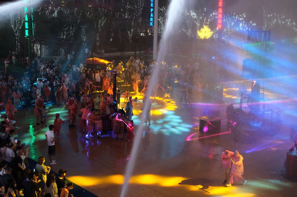 颜色泼水派对是上海宋城夏日限定的节目,节目开始会有两场助兴表演,分别是国际男演员表演的水鼓秀,以及外国美女表演的热舞。表演过后我们就可以拿起手中的泼水装备开始激烈的泼水大战了,另外现场还有灯光、喷水器,以及DJ在搞气氛,玩得特别嗨,现场充满了欢声笑语,好不热闹,不管男女老少在这里都可以玩得很开心。