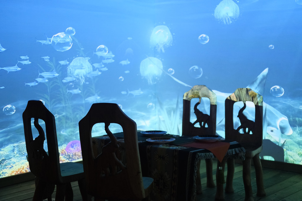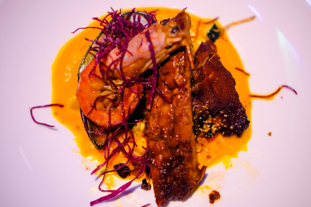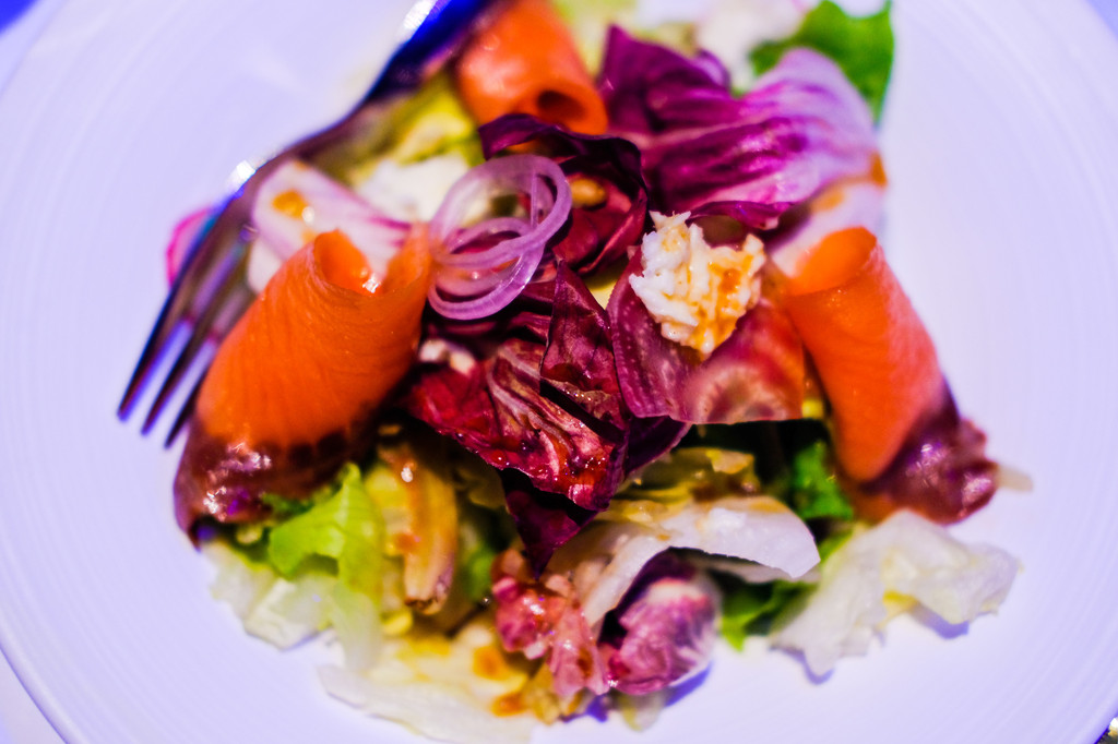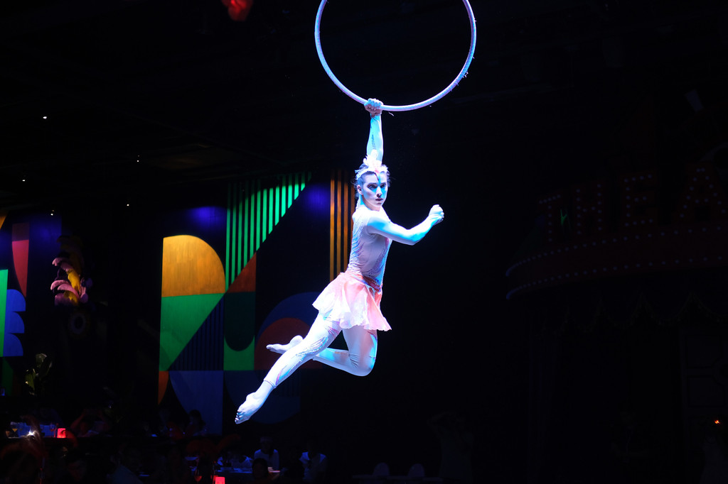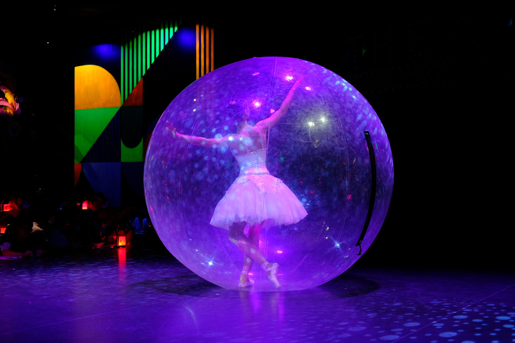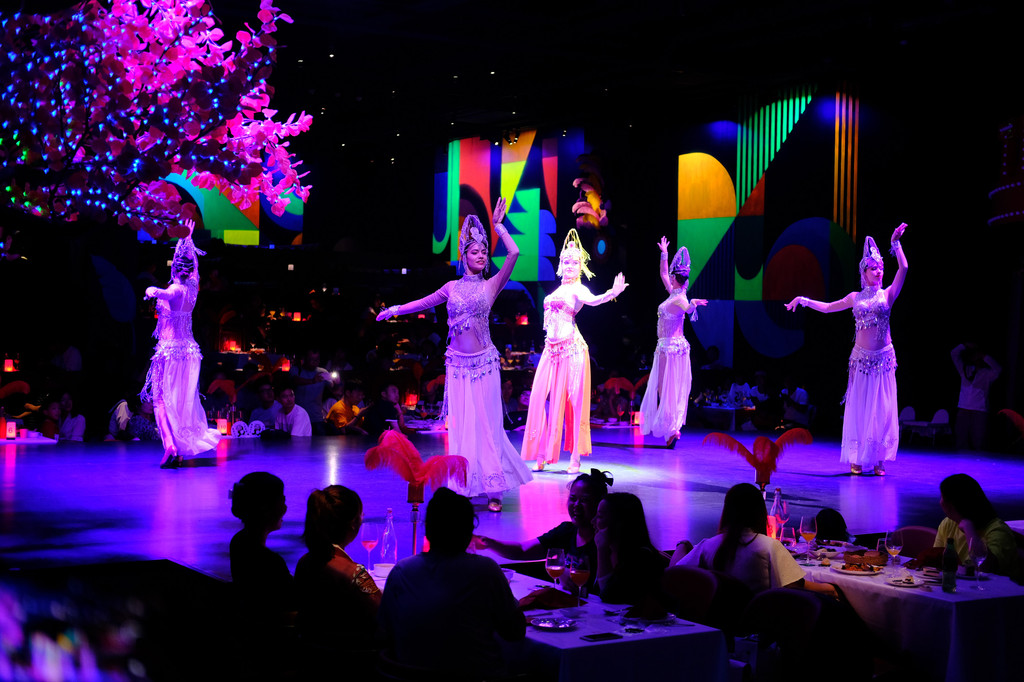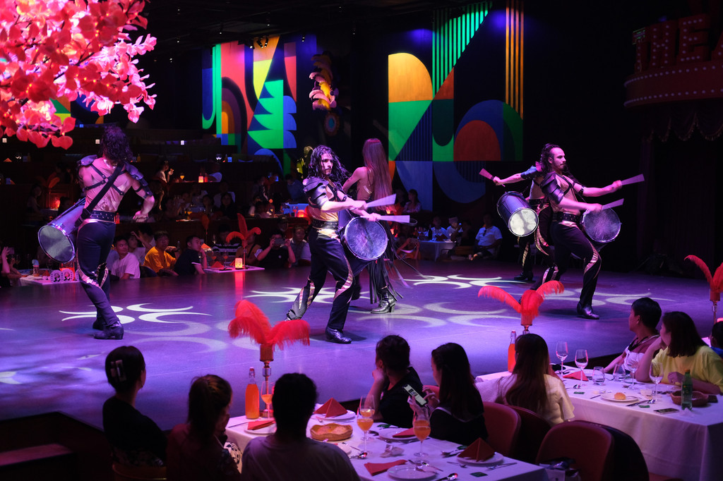 这是一场盛大的南美“舞”餐,是一场可以吃的舞秀,可以玩的盛宴。在这里我们既可以观看由阿根延、古巴、乌克兰、俄罗斯等多国演员热情演绎的南美鼓舞、阿根廷舞蹈、水晶球里的芭蕾、圆环舞蹈、爵士乐和草裙舞,又可以品尝到富有异国风情的五道精致菜肴,分别是黄金全麦餐包、萨尔瓦多金枪鱼蔬菜沙拉、奶油蘑菇浓汤、海陆双汇、星空之眼西点,饮品则是有意大利红酒和橙汁可供选择。