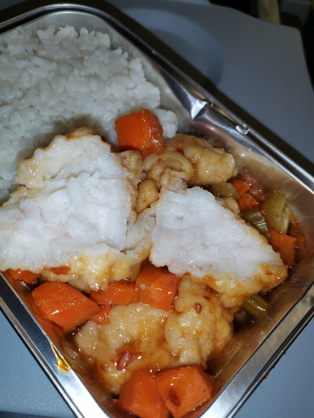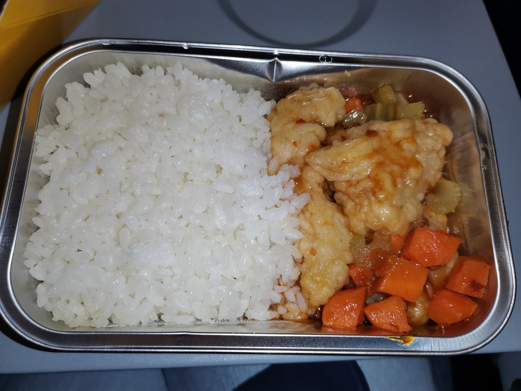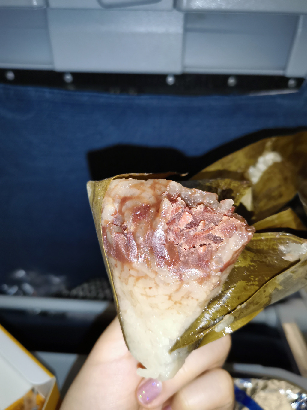 旅途的第一餐是意料之内的飞机餐,意料之外的是如今国内航班的餐饮进步很大。我要的是鱼肉饭,很热乎,不腥很嫩。当时正赶上端午放假,豆沙粽子算是意外惊喜了。