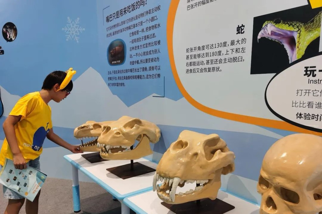 面前一大排各种动物的头骨模型,做得相当用心,竟然可以伸手进去掰开每个头骨的嘴巴试试张开度。我也是第一次知道,原来蛇为了吃大家伙,可以张嘴到180度,甚至还能自己脱臼。