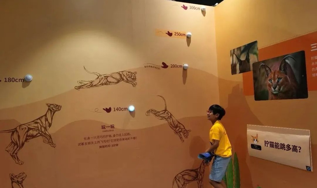 和猎豹比完不算,屁孩还要和狞猫比谁跳得高。一面跳一面可以拍亮相应高度的灯,屁孩跳了一次又一次,不好意思嘞您老,2米5也没跳到,就别跟狞猫比了吧,哈哈!