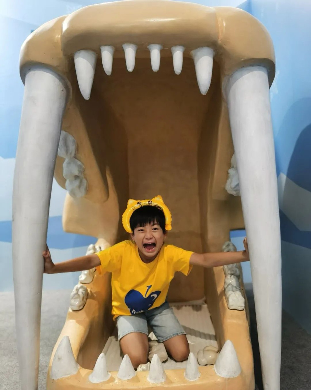 小屁孩试了试“虎”口补牙,哈哈。剑齿虎算是猫科动物的老祖先,它们的牙齿到底长什么样呢?坐进它的大嘴里试试!