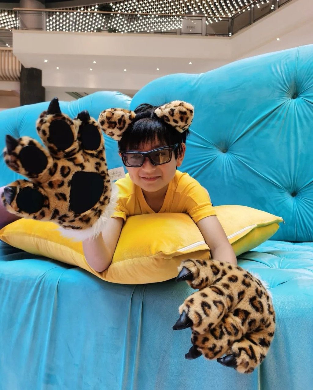 最喜欢做猫咪的小屁孩激动万分地穿戴上了手套、头箍,甚至尾巴。“妈妈,帮我戴一下。”