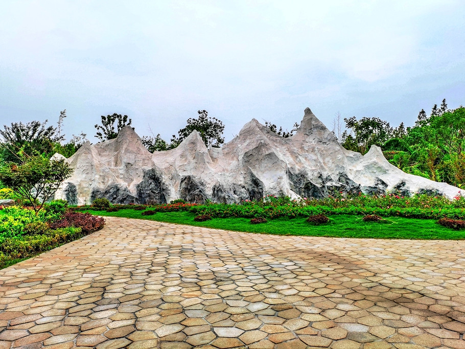 园内的花草不算很艳丽,草地上有模拟冰雪的白色物。