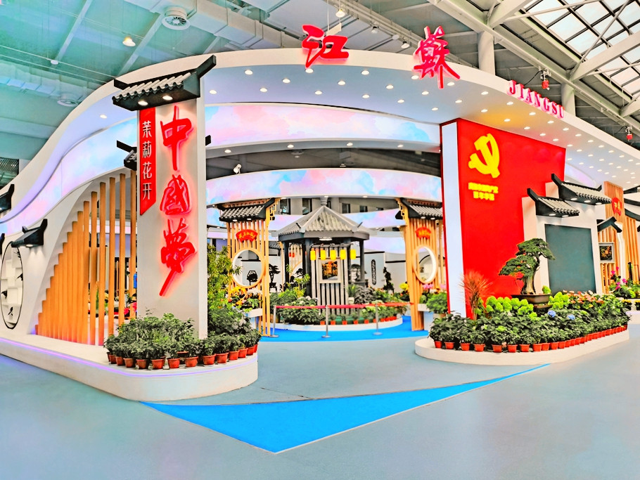 以祥云灵动为氛围,以插花、盆栽、盆景等错落布局为点缀,以江苏名花茉莉花为重衬,渲染江苏的时代风采。