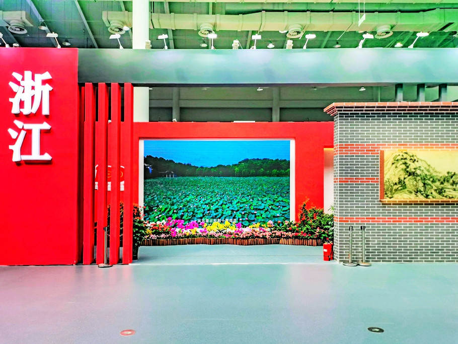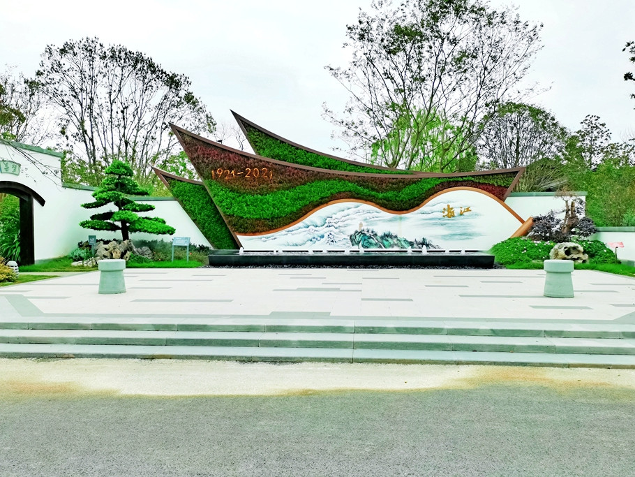 浙江馆布景以“红船百年,花开浙江”为主题,以建党百年奋斗历程为主线,将红船、绿竹、生态住宅等设计元素与花卉园艺展品完美融合。