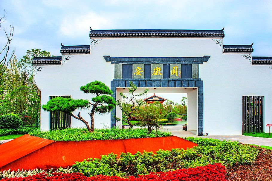 安徽园主题为“皖风之美、水墨新韵”,特色植物、园林建筑、景观小品等要素之间的有机结合,营造出生态、祥和的空间氛围,使游人全方位的感受安徽经济、社会、文化特色。