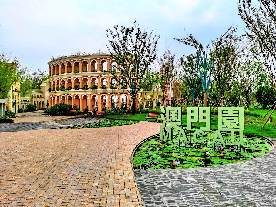 澳门园主题“梦回濠江”。展园以“绿色卷轴”的形式诠释梦的形态,以绿植为造园基底,展现澳门独特的中西文化交融的城市花卉景观风貌。澳门园太适合拍照了,围绕圆形喷水池,是几圈不同风格、不同颜色的建筑群,充分展现了中西文化交融的澳门城市风格。而且这些建筑有花墙、花窗、花廊,来一场“出境游”吧。