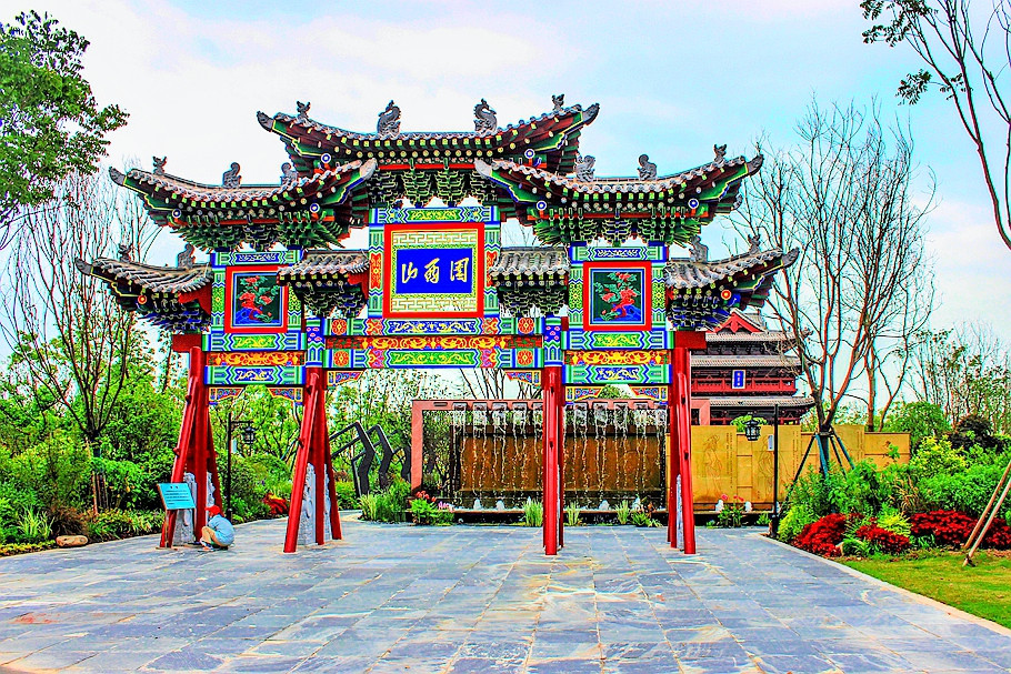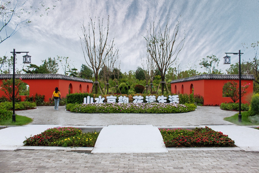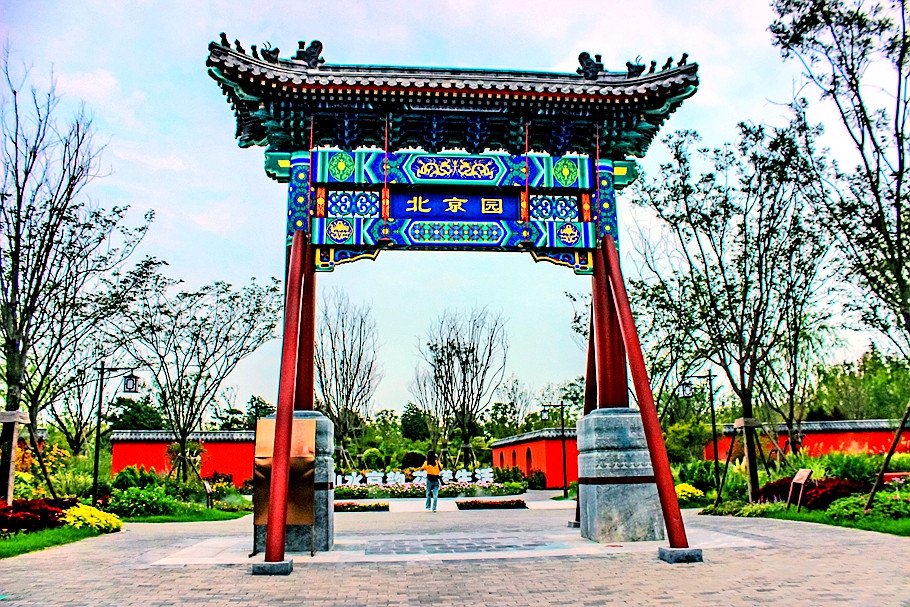 北京园门口竖立着一座木牌楼,上写着“北京园”,里面的红墙非常亮眼,这让人很容易联想起北京的园林景观建筑。