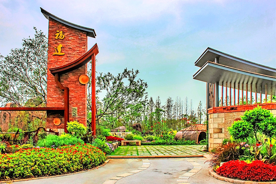 福建园主题为“锦绣山河中国梦,花韵流芳福建情”。福建园划分为“福建人家”主入口区、“日月同辉”滨水景观区和“花田喜事” 主题植物区,提取古厝、飞檐、红墙、土楼等福建文化印记, 运用芭蕉、枇杷、竹子等代表性植物,以及三角梅、鸡冠花等 特色花卉,打造一个浓缩福建文化的特色浪漫花园。