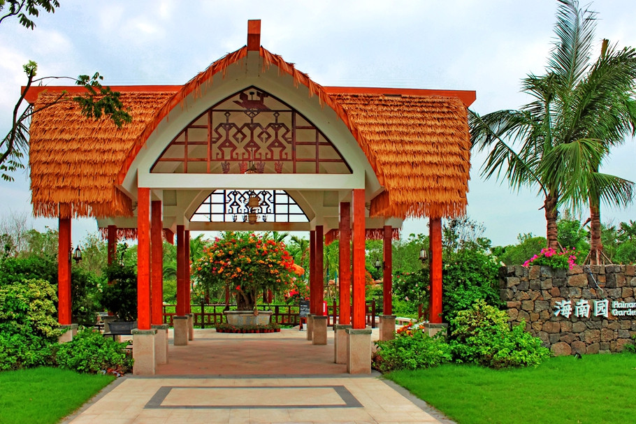 海南园主题为“花开海南,全民共享”,通过入口船型建筑大门、鹿回头雕塑、碧水沙滩和岛屿,充分展现了海南地域特色以及黎族传统文化。