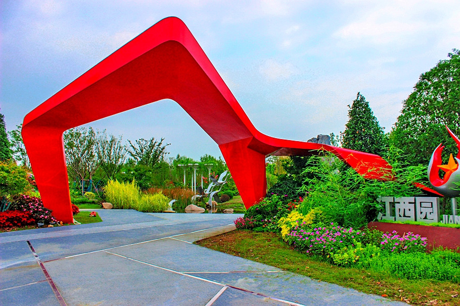 江西园主题为“杜鹃花花开花更艳”。展园围绕红色飘带、绿色山水及多彩科技三大线索展开。