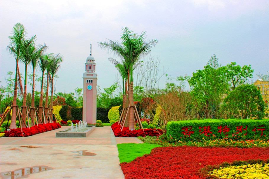香港园主题“寻香园”。模仿尖沙咀钟楼的构筑物,两旁种植了盛开的洋紫荆、香港原生品种杜鹃、桂花和丝木棉等。