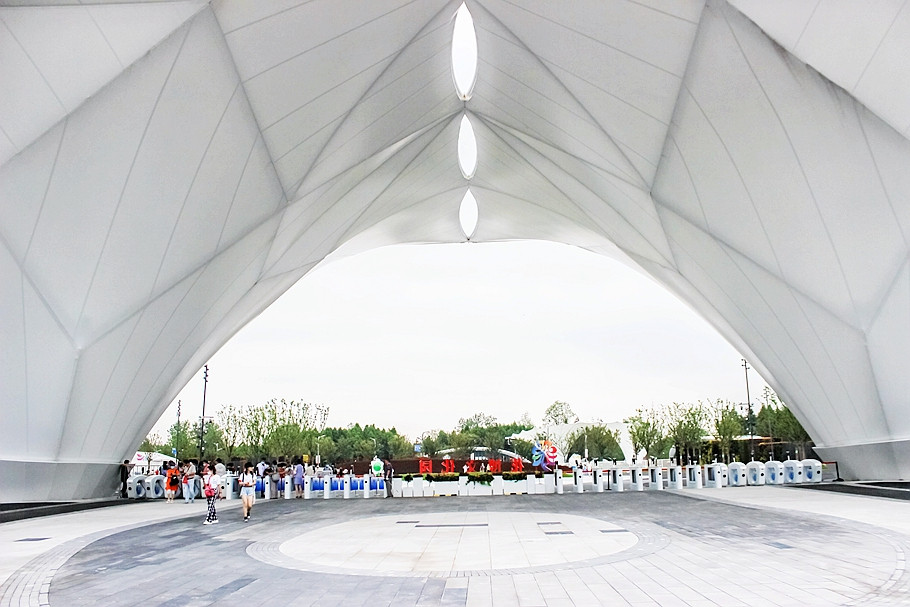 24日阴天,上午吃过早餐,从农家乐住地驱车前往花博文化园,所有的停车场都已经关闭,只开放北园P1一个停车场,通过停车场进入北园,首席映入眼帘的是的主入口的建筑物,它既形似两棵枝繁叶茂的大树,又胜似两朵盎然怒放的白玉兰。建筑物大门高19.21米,宽100米,寓意中国共产党建党一百周年。