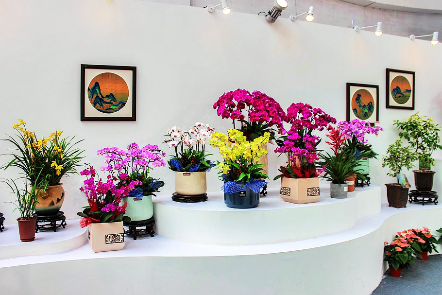 在盆花展示区,数百盆精品盆花错落有致地摆放在深灰色背景的高低展台上,极具层次感。