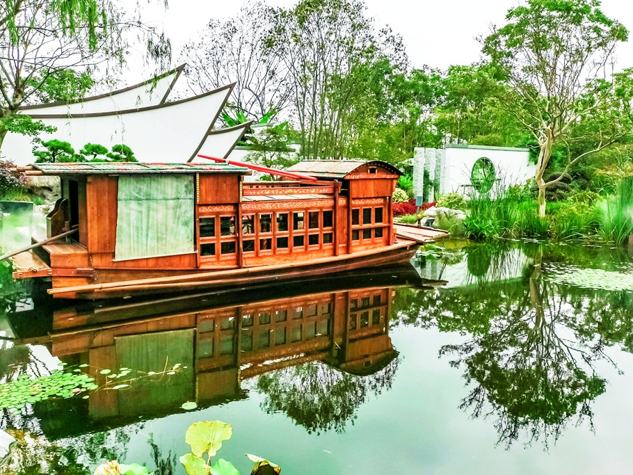浙江园主题“逐梦·浙里”,运用浙派园林造景手法,将展园打造成一艘“引航远帆”的航船。
