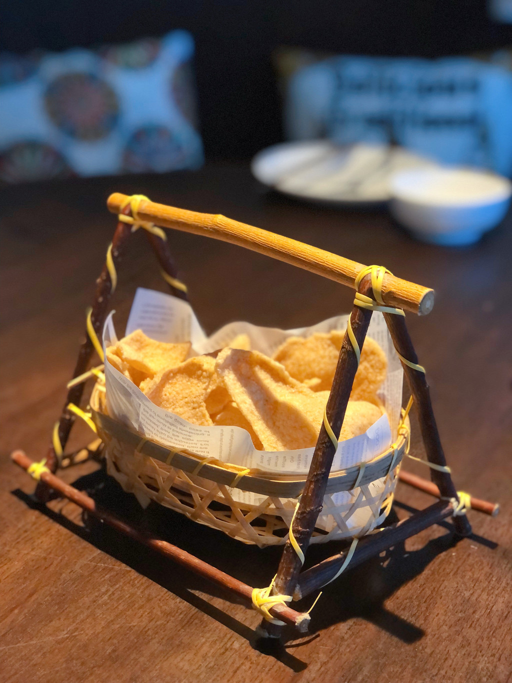 服务员手脚麻利,刚坐下就端来了热水,还送上一份装在精巧小篮子里的泰式虾片。