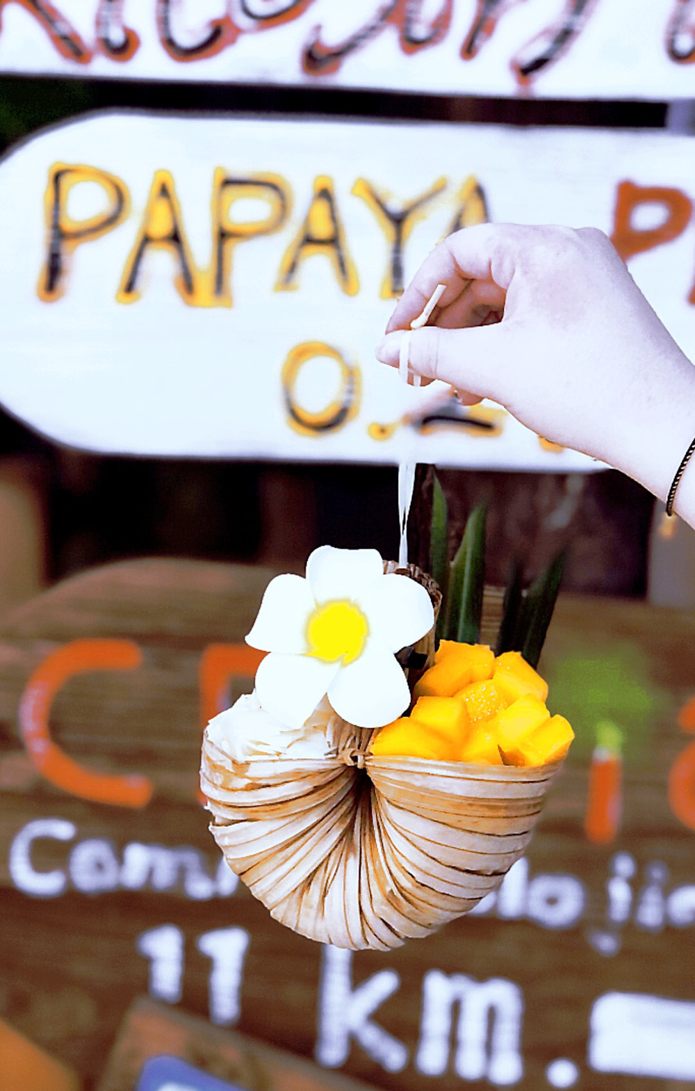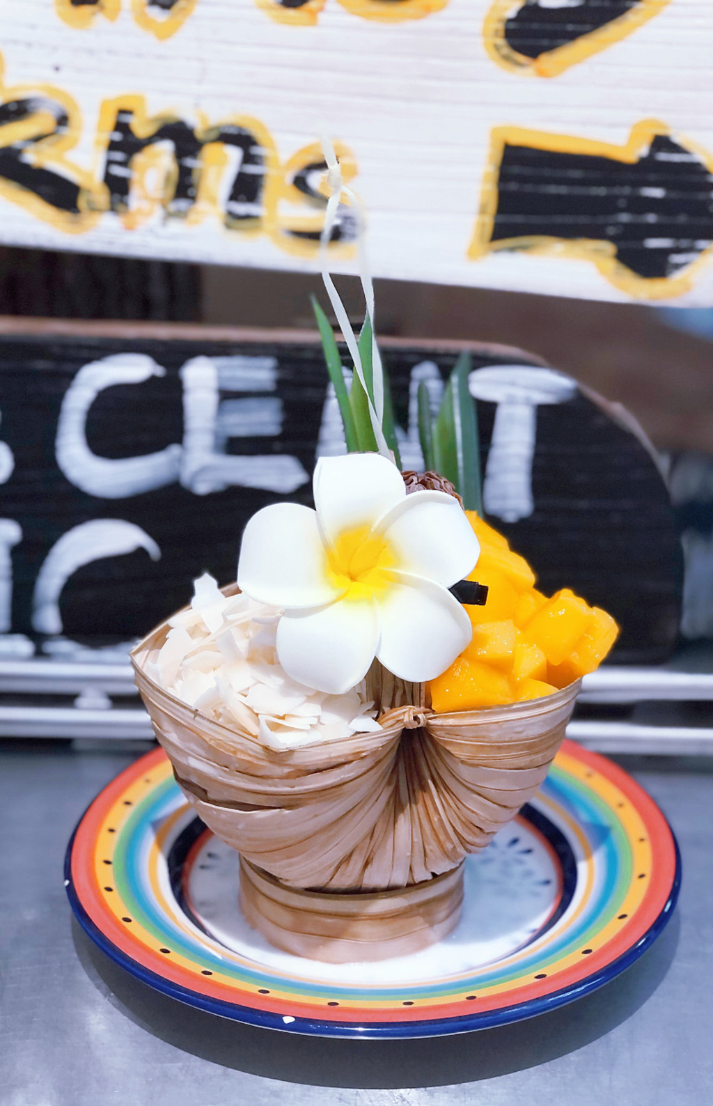 #手提达叻椰子沙冰#直接用半边椰子壳装着碎碎的冰沙、椰子片、芒果等佩戴一朵鸡蛋花,炒鸡吸睛的甜品,拍照发朋友圈点赞率第一。