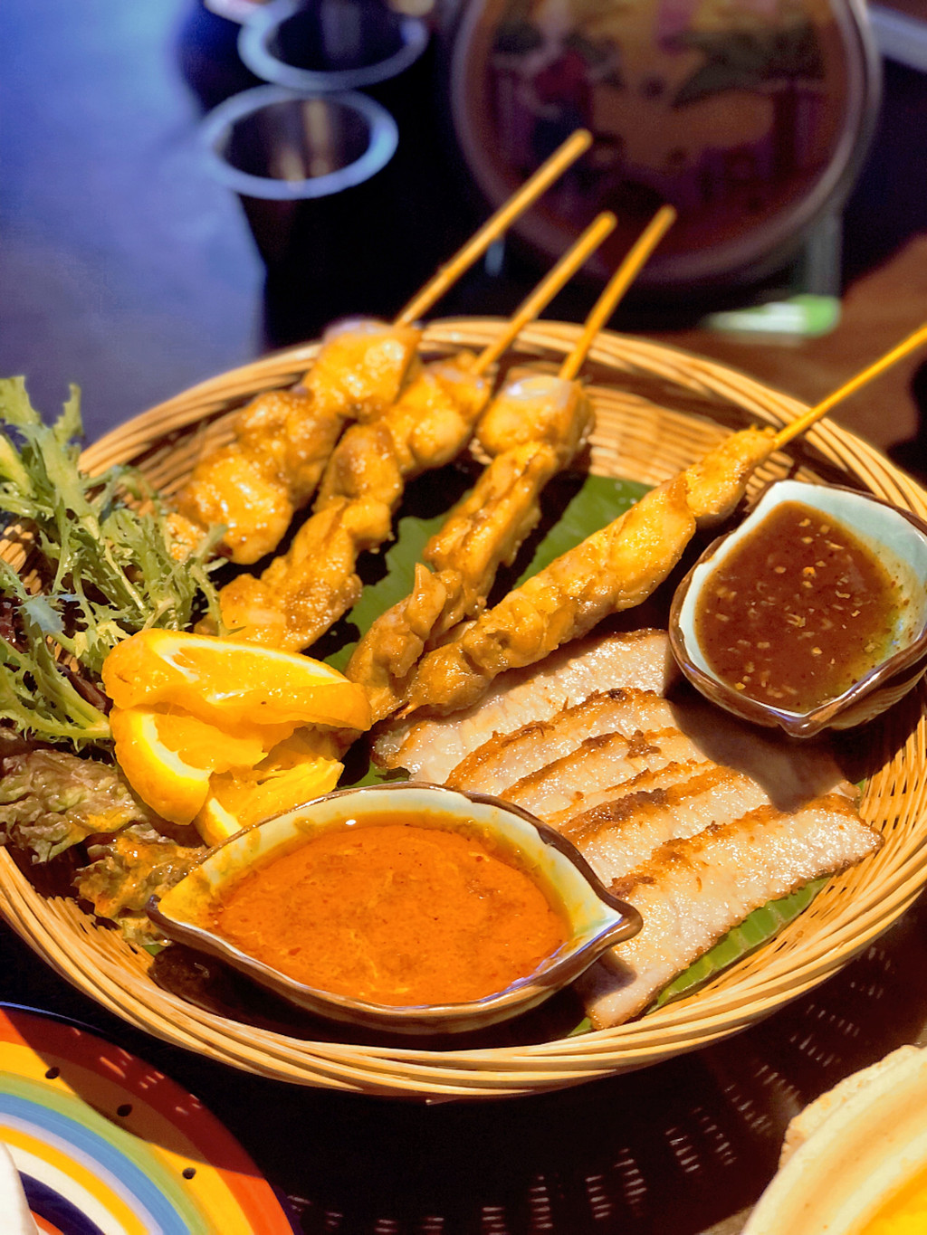 #街头香烤双Q肉#猪肉的品质很好,没有腥味,炭烧的火候也恰到好处,使猪颈肉表皮留下脆脆焦焦的一层表皮,内里依旧鲜嫩多汁,但又不失劲道,不用沾任何调料就已经很好吃了。再佐以该店秘制的酱料,酸酸甜甜,正好解掉吃多了的腻味儿,太赞了!还可以另外一种吃法,那就是用猪颈肉沾上冬阴功汤吃,同样很美味,推荐大家尝试哦!