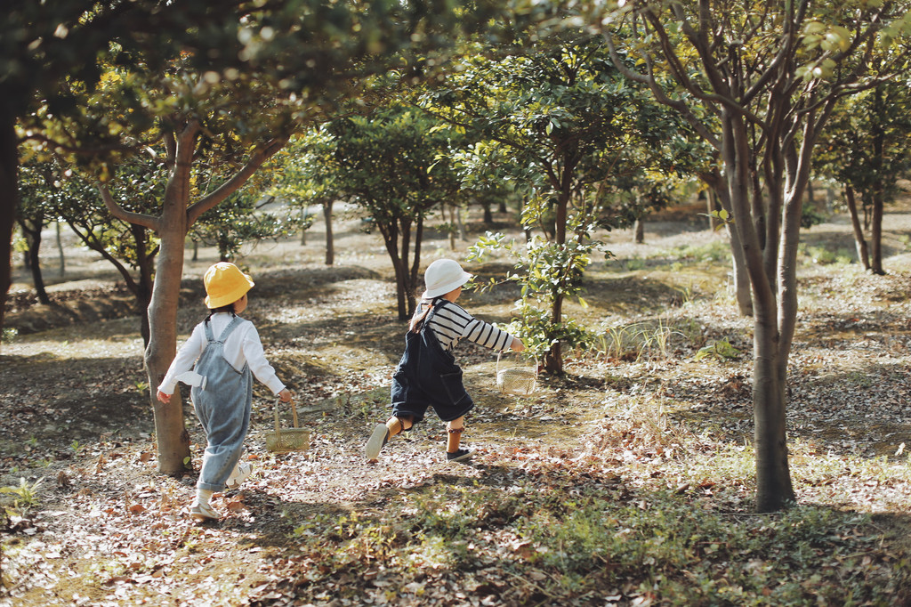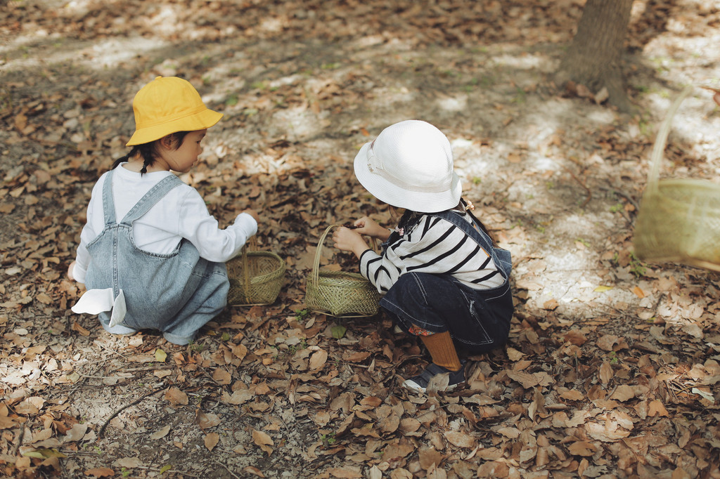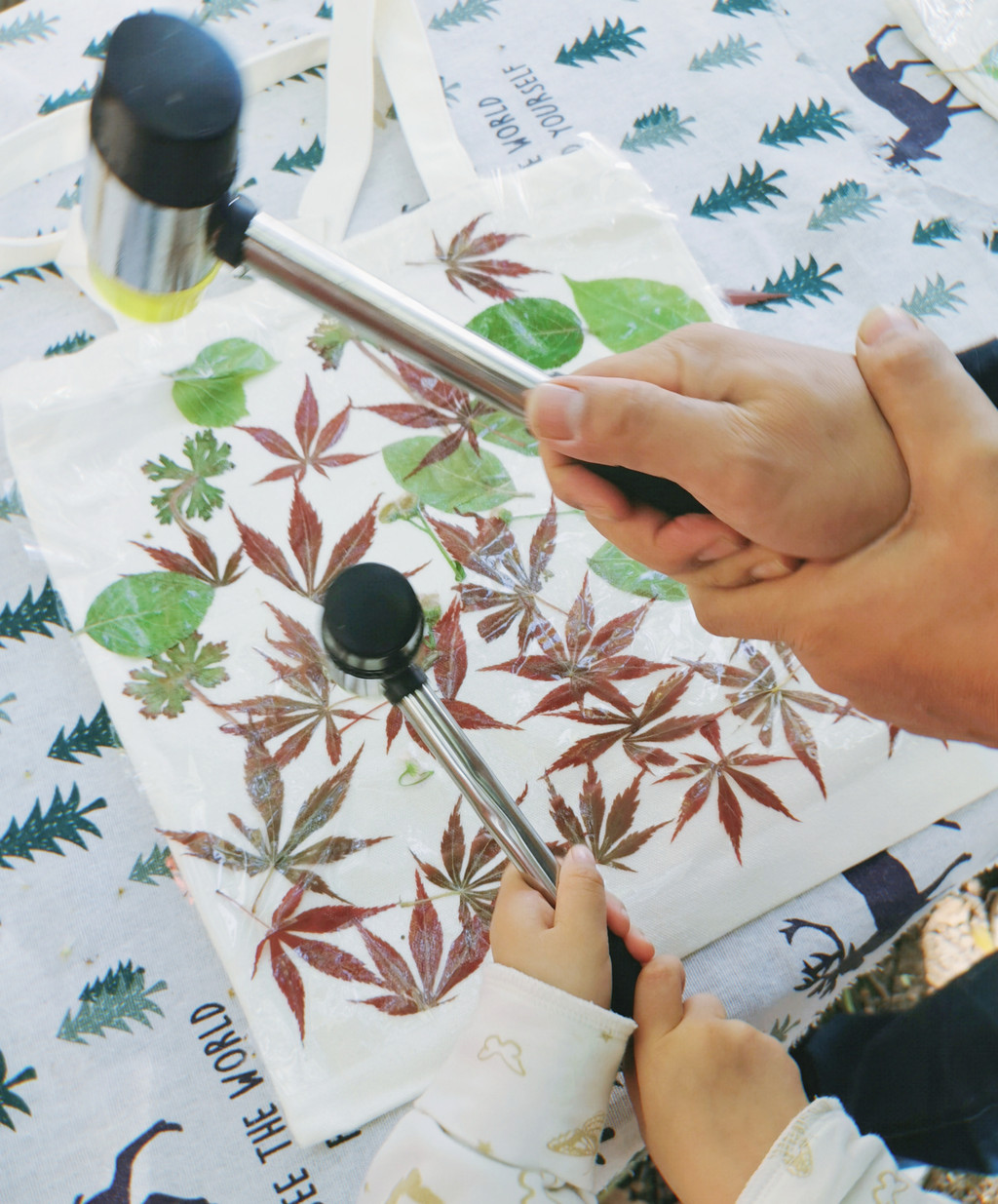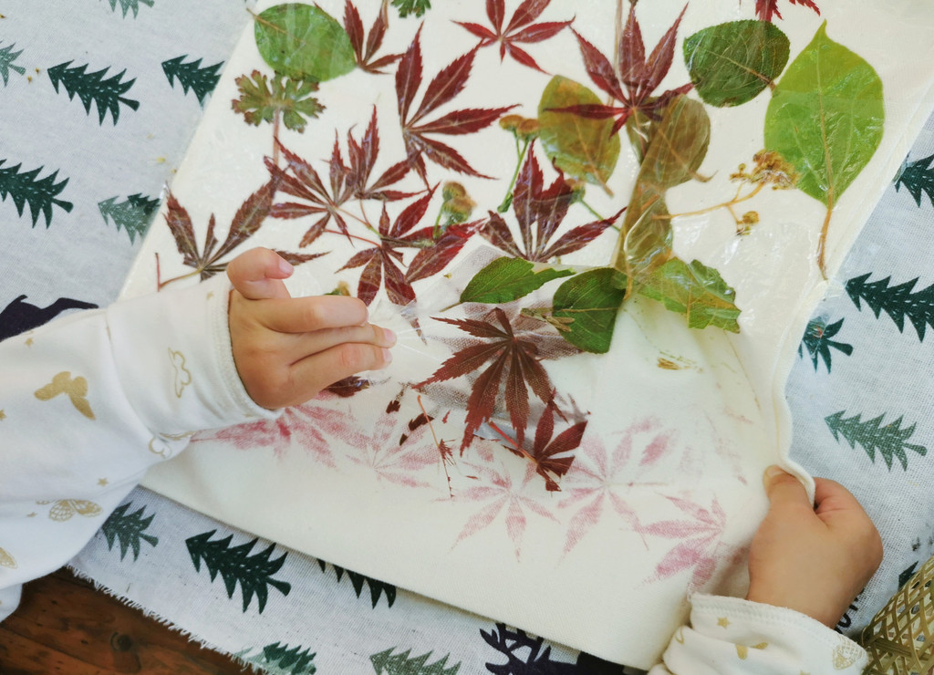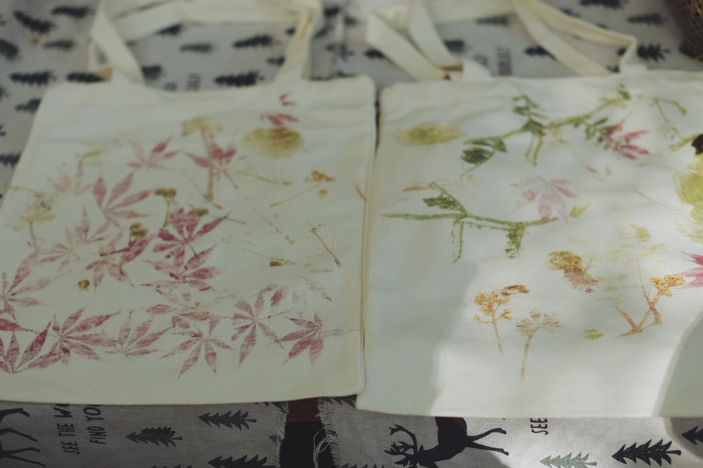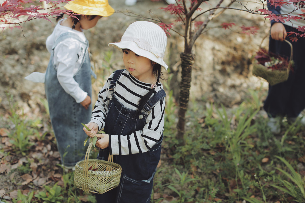 手执小竹筐,林子里采集植物素材,红的、绿的、黄的……