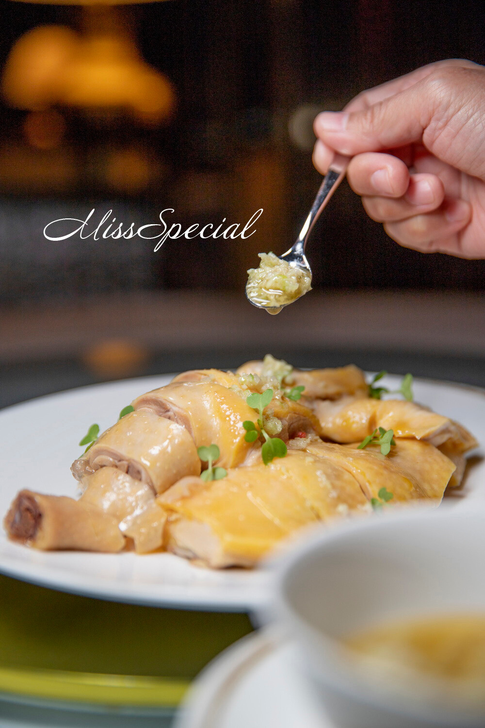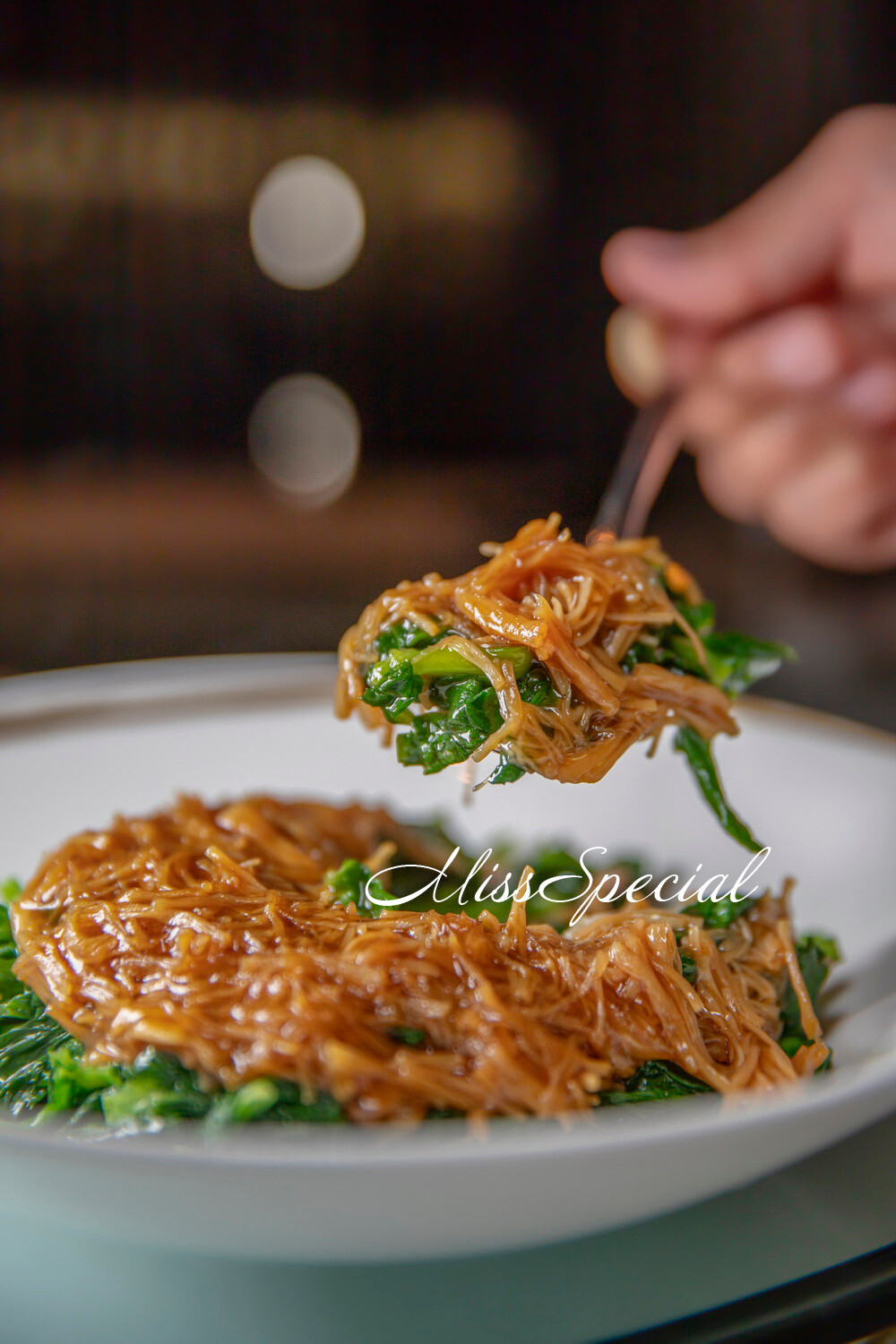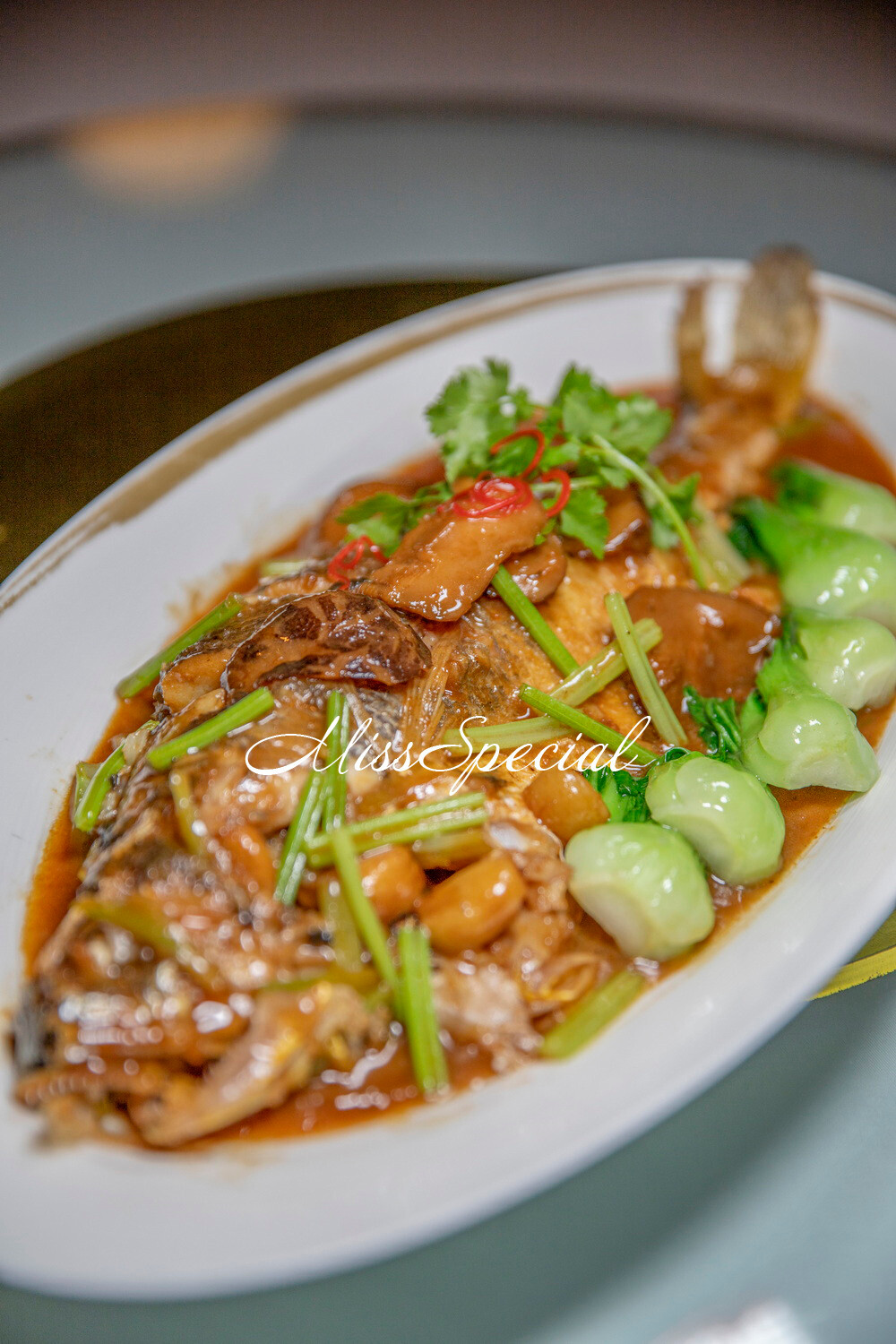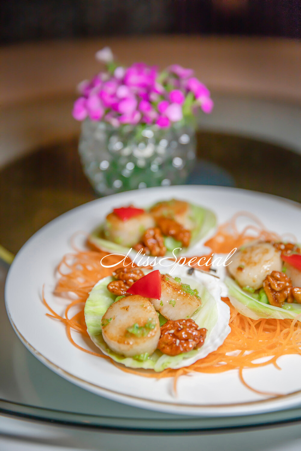 杏花村汾酒白露蛏子透着一丝丝酒香,素烧鹅外皮脆而内馅鲜。黄焖瑶柱花胶辽参的汤品可谓真材实料,汤底要熬制八小时,香浓回味。家烧大黄鱼、珀香芹炒加拿大带子,带来海洋的气息,白切鸡皮脆肉嫩,配上粤菜主厨才能出品到位的酱汁,尤其令人喜欢。豆苗这样的青菜,配上瑶柱丝,口感都变得与众不同了。
