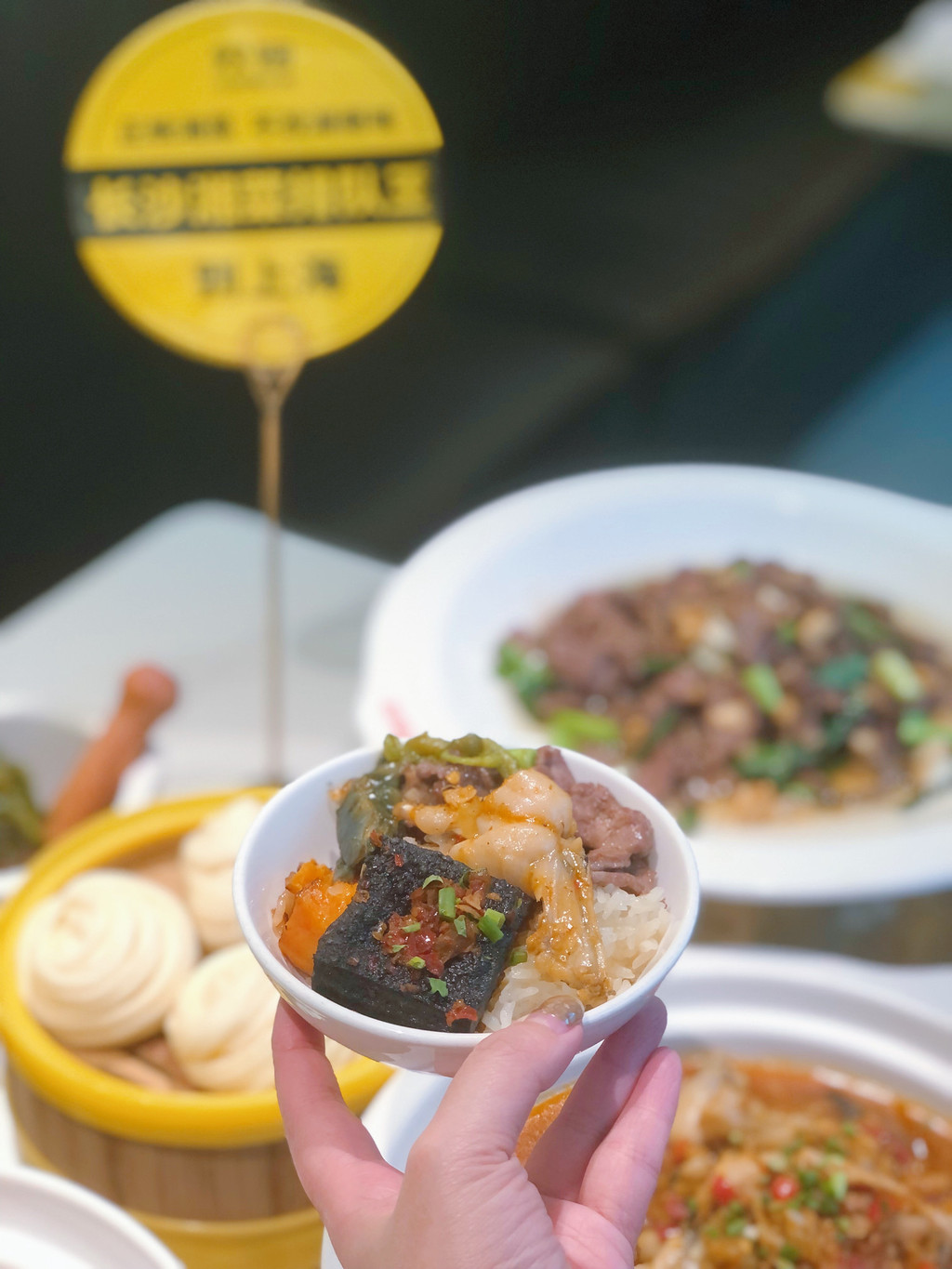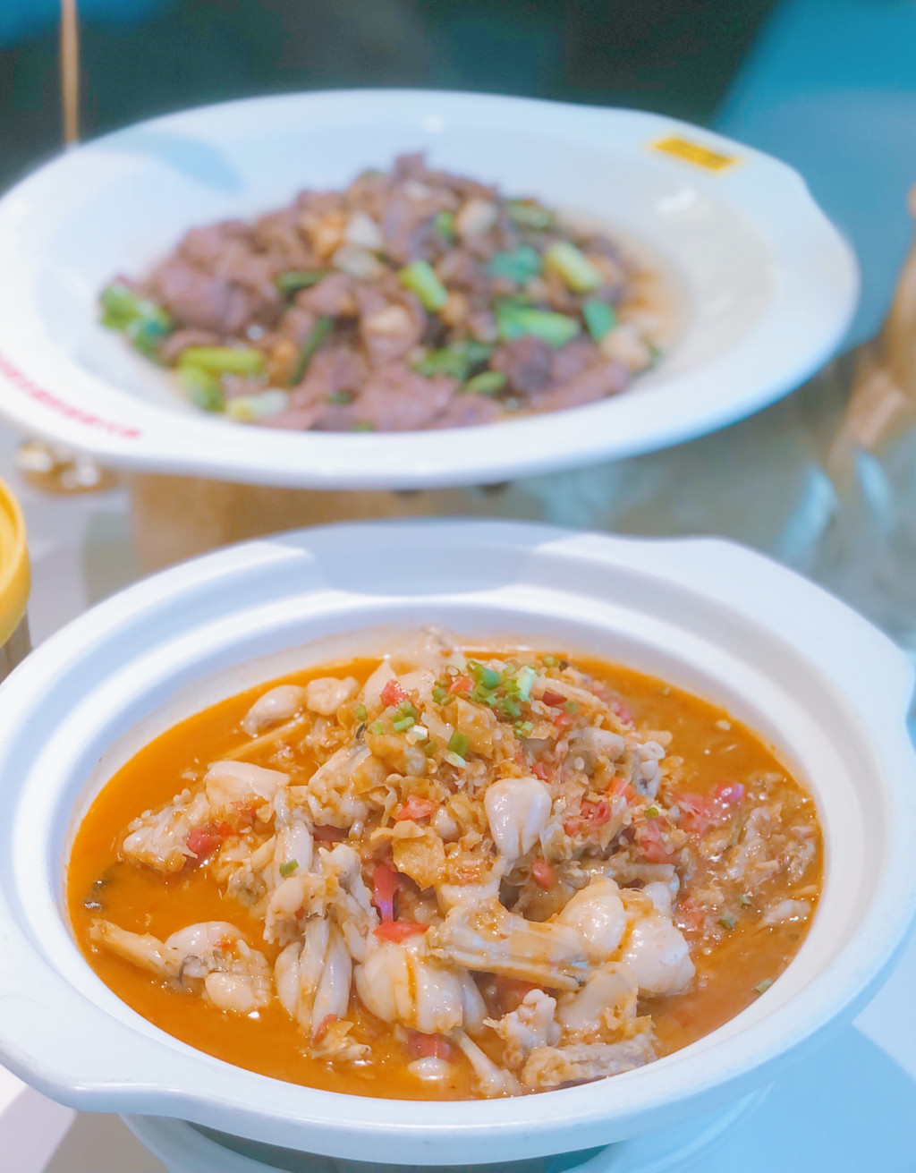来一碗猪油拌粉或者杂粮红薯粗粮拌:炊烟小炒黄牛肉、凤爪肉蟹煲、酸辣紫苏牛蛙等菜吃。