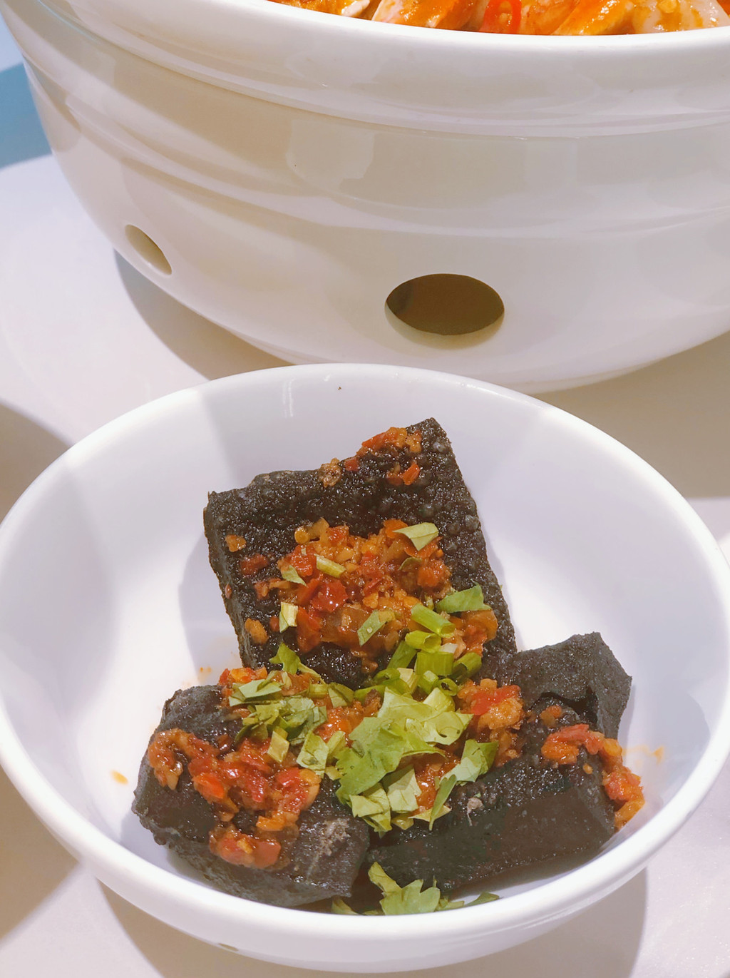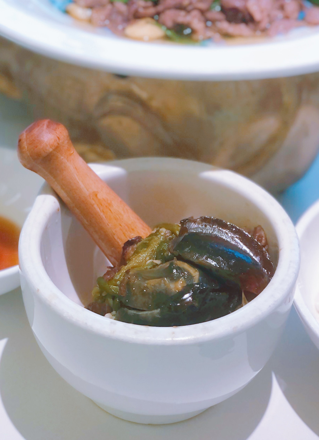 长沙限定小凉菜#皮蛋辣椒擂茄子#钵里面有整整齐齐的茄子、皮蛋和辣椒,吃之前用杵来搅拌一下,很入味很解腻,等菜的时候空嘴就吃掉了半份,盘它!送它出道!