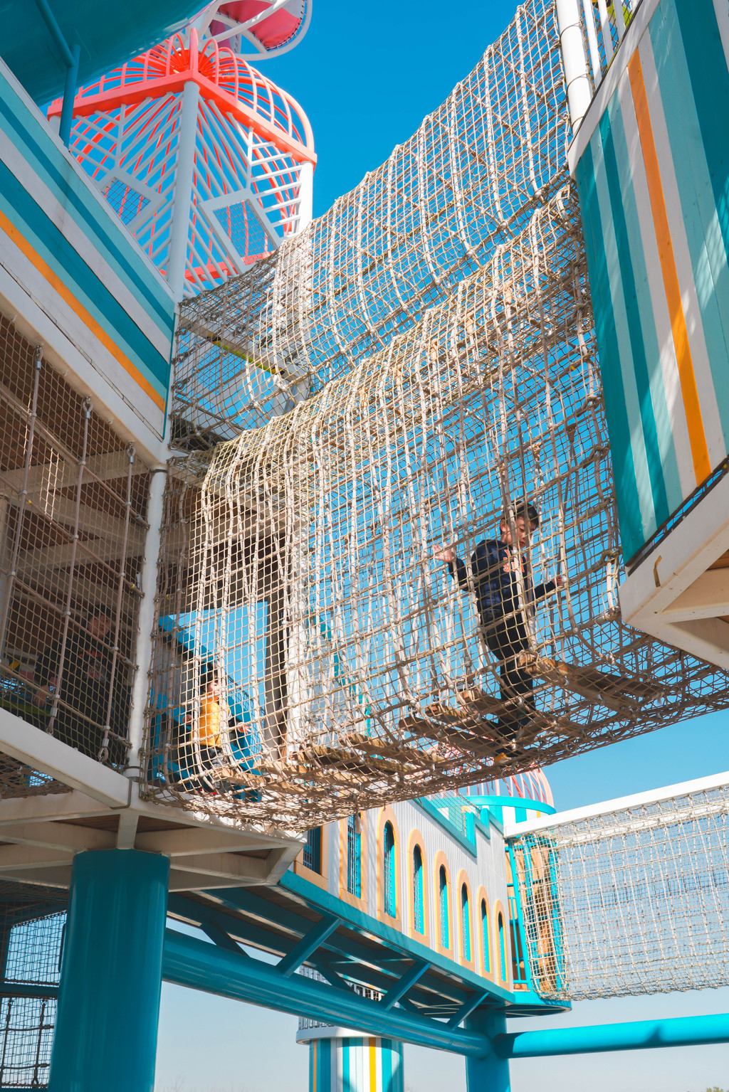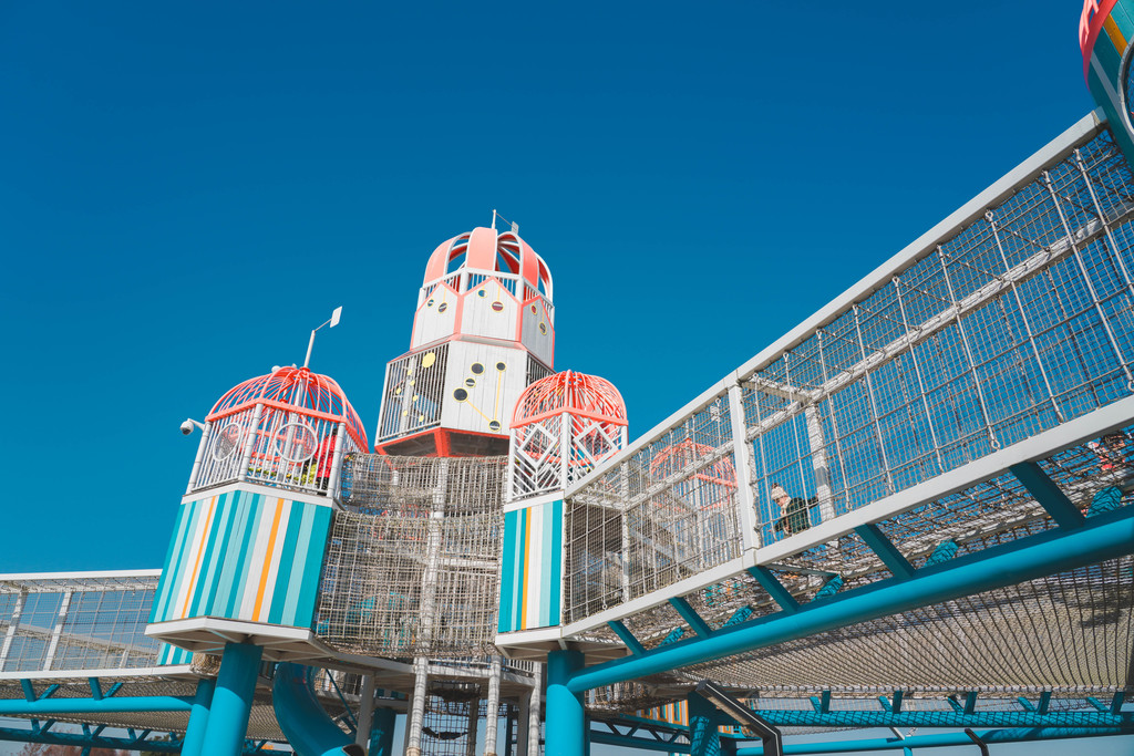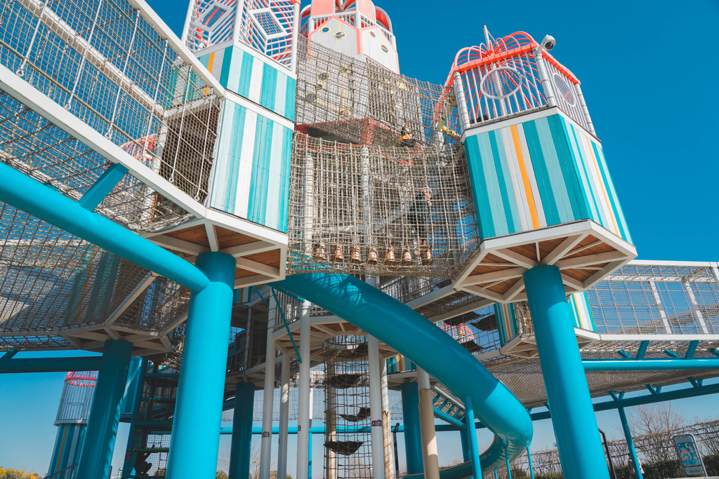有很多线路,几乎没隔一段距离就有个大的滑滑梯,孩子们可以选择从滑滑梯滑下,然后挑战另一条线路,不同的线路都能抵达中心的高塔。