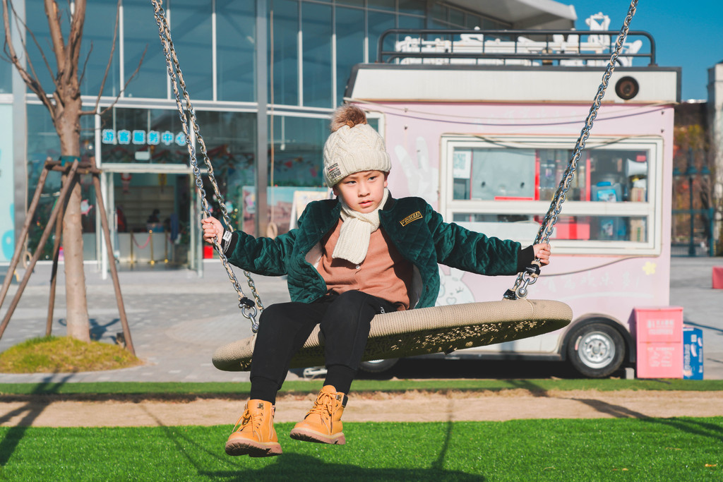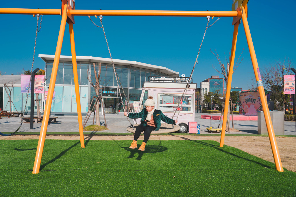 兔宝王国的中央草坪旁是一片创造湾,有很多秋千组合,大人和小朋友们可以在这里随意荡秋千。