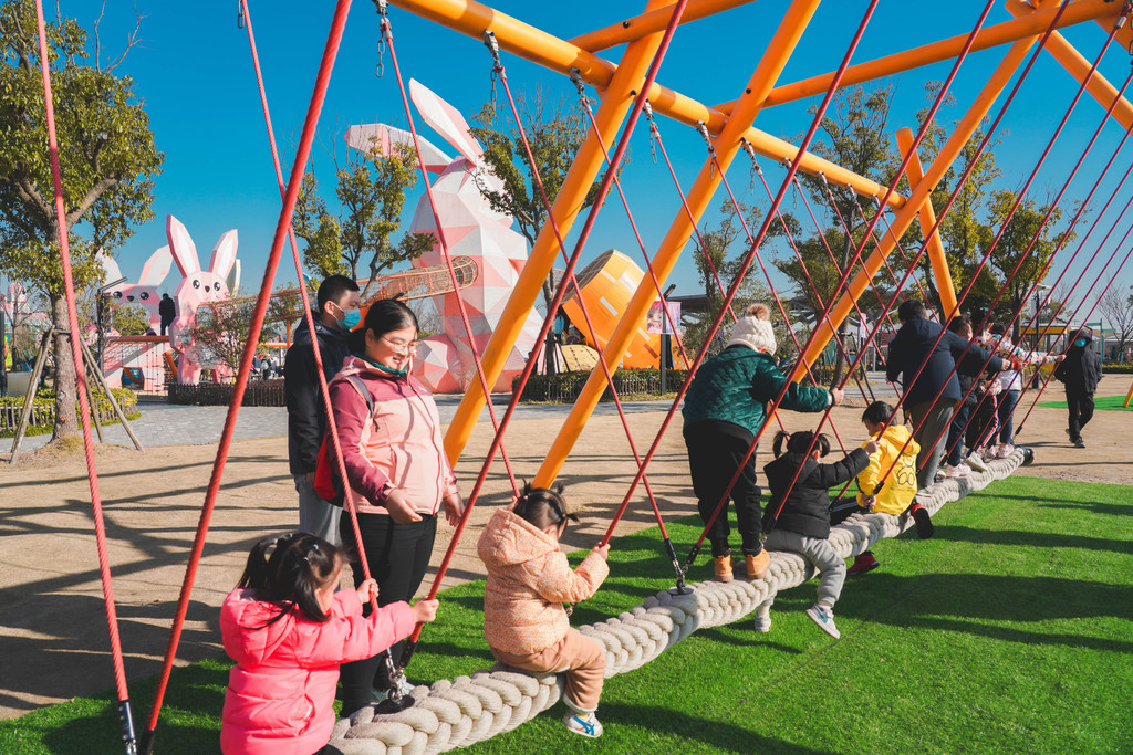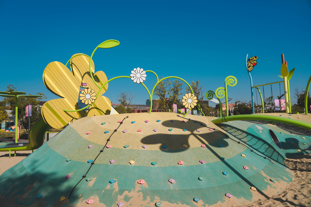 兔宝王国里包括兔宝堡、萌兔家、遗忘角等主题玩区,小朋友可以从兔子拔萝卜的滑滑梯上滑下来,也可以爬上花儿朵朵开的攀岩坡。