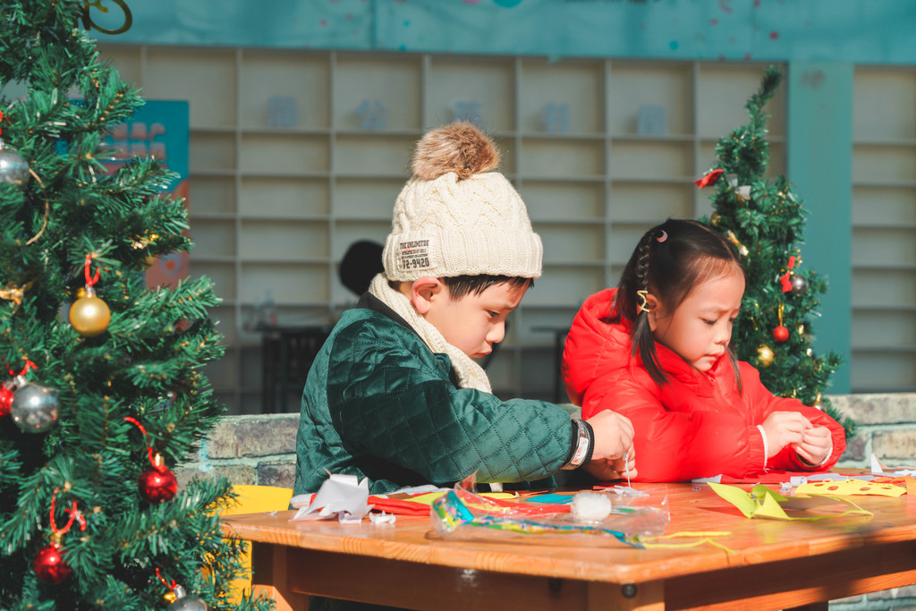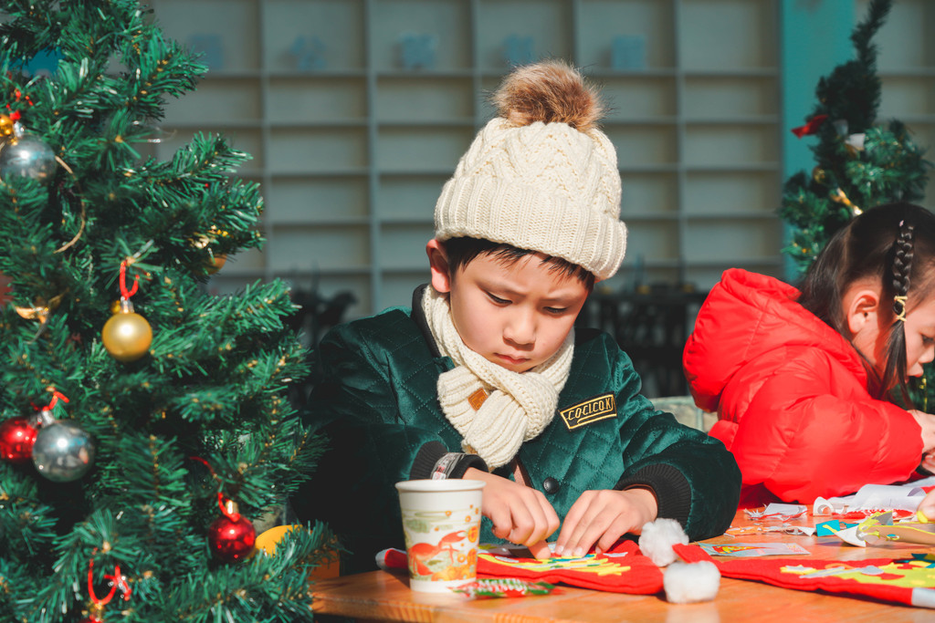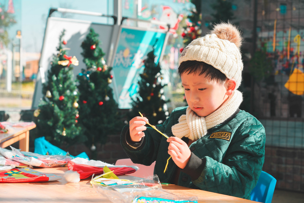 领过手工包之后,元宝就虔诚的坐在小板凳上,认认真真的打造属于自己的圣诞帽,可以按图索骥,也可以发挥自己天马行空的创造力。