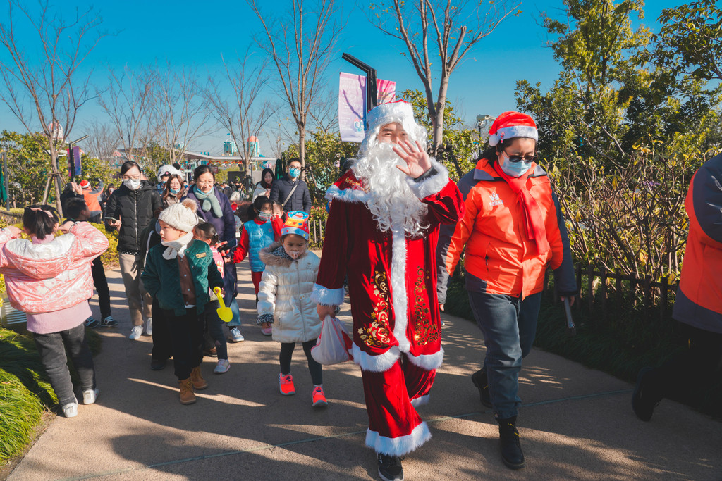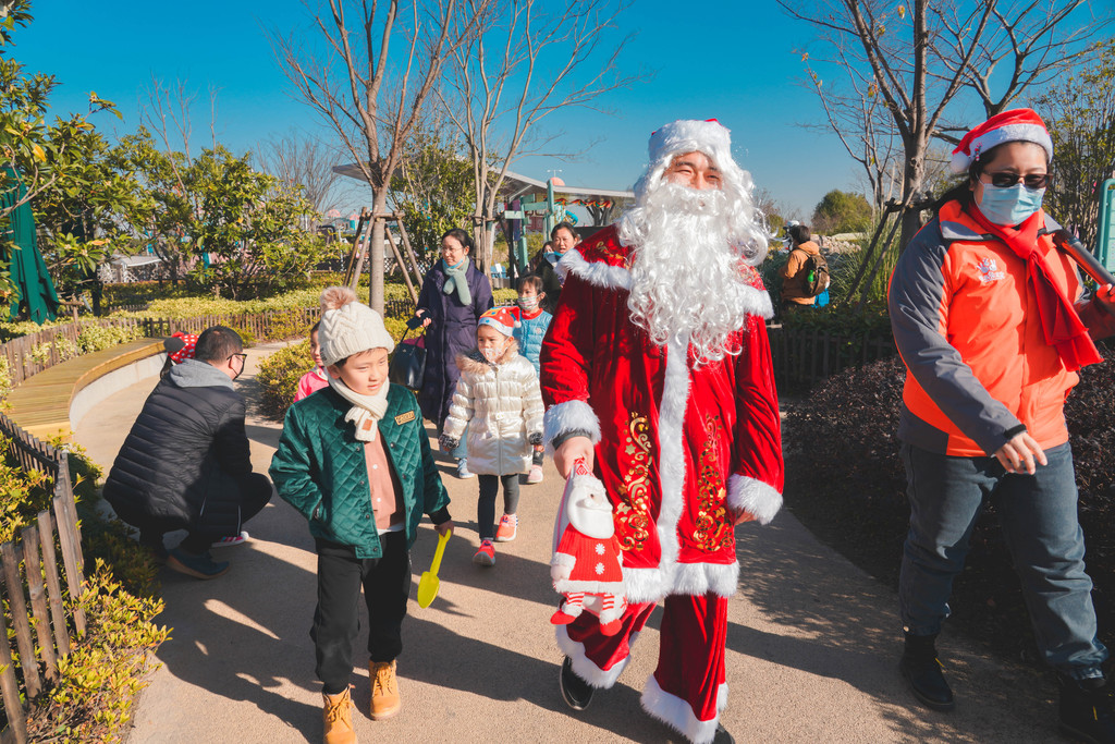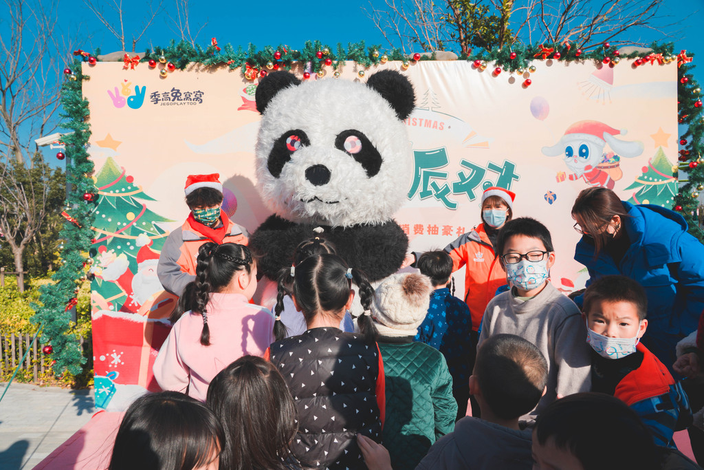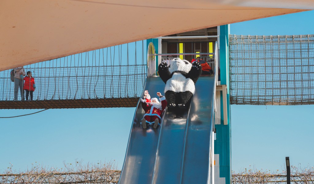 下午两点是超级可爱的大熊猫和圣诞老人巡游,看着萌萌的大熊猫和圣诞老人从成长世界的大滑梯上滑下来,现场的大人和小朋友都沸腾了,一拥而上。