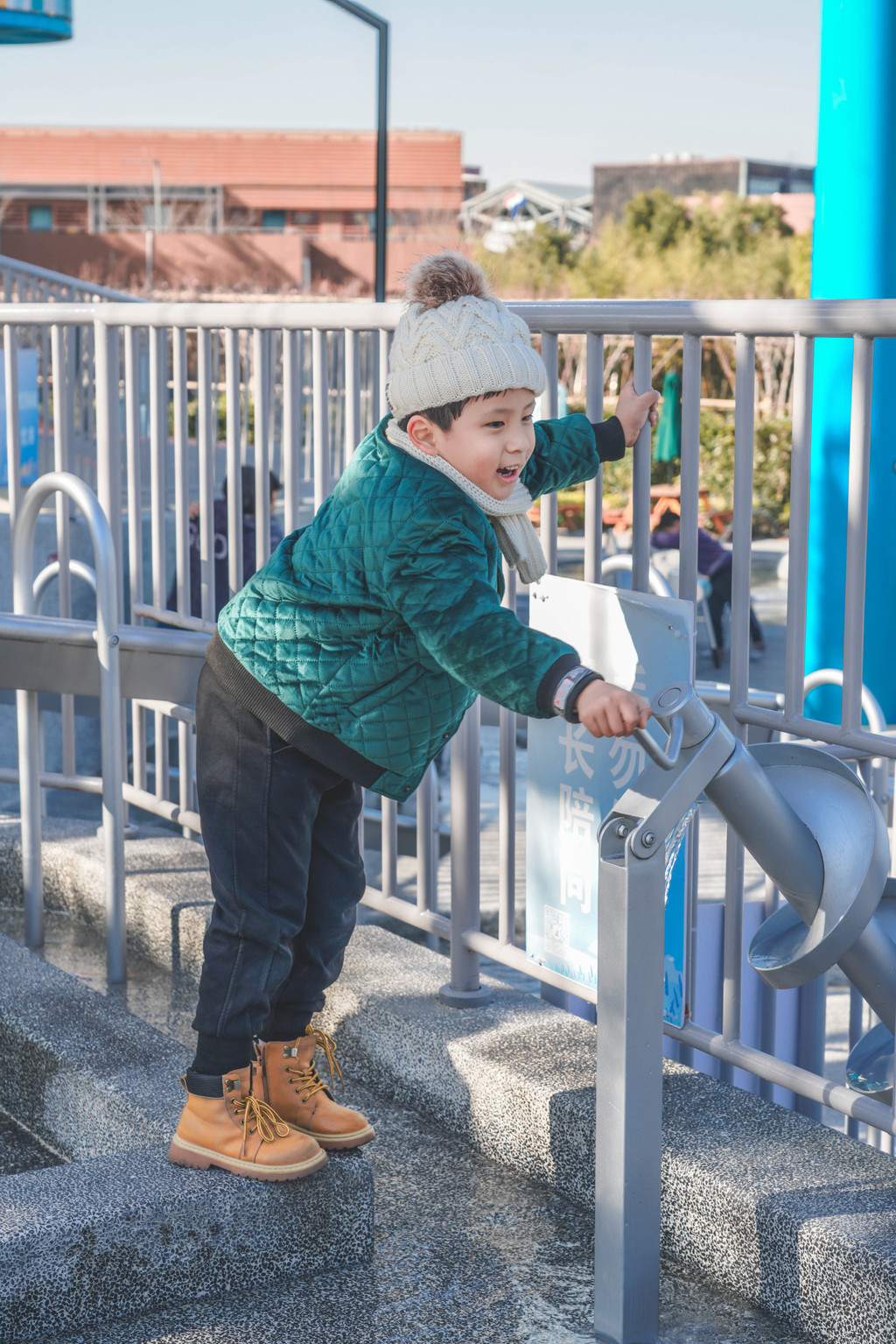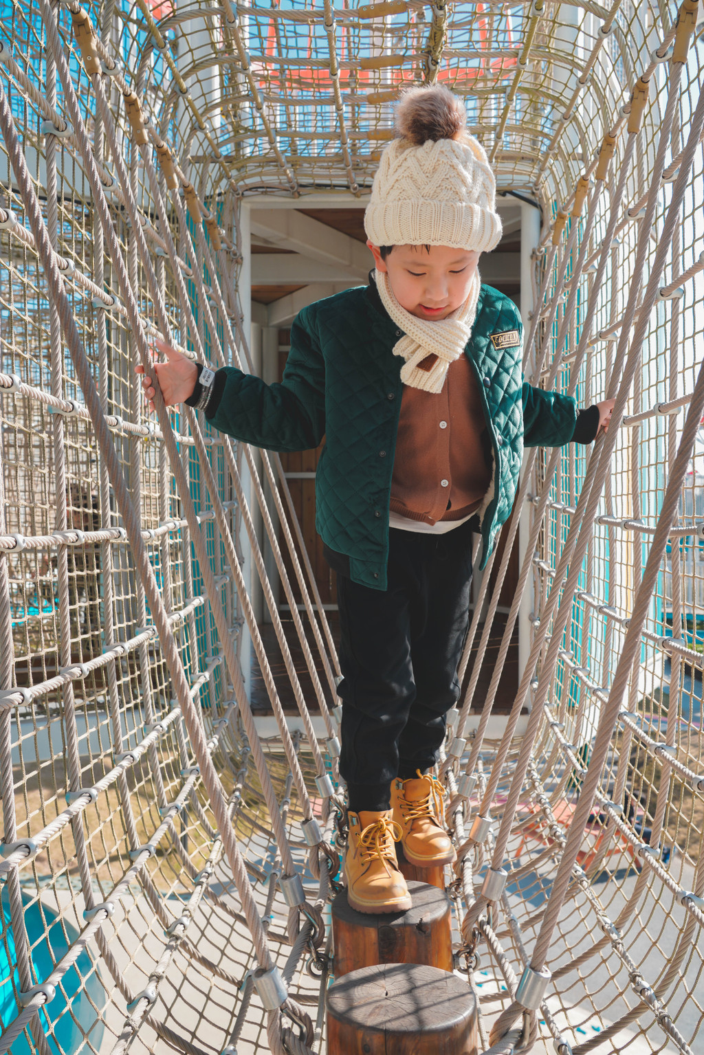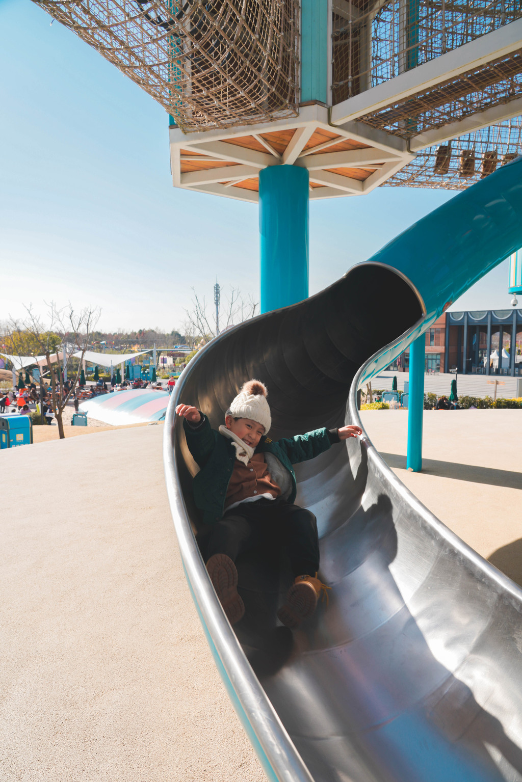 几乎爬一段就要停下来等我一下,从高塔蜿蜒而下的滑滑梯元宝是开心的一滑到底,而第一次玩的我则发出了刺耳的尖叫声……