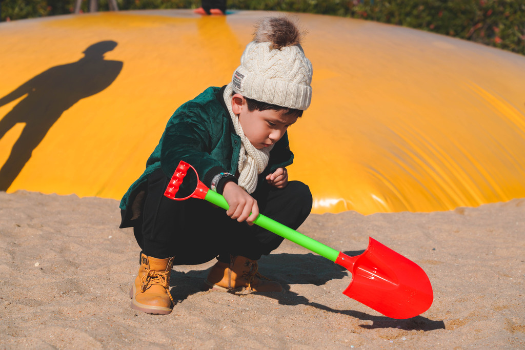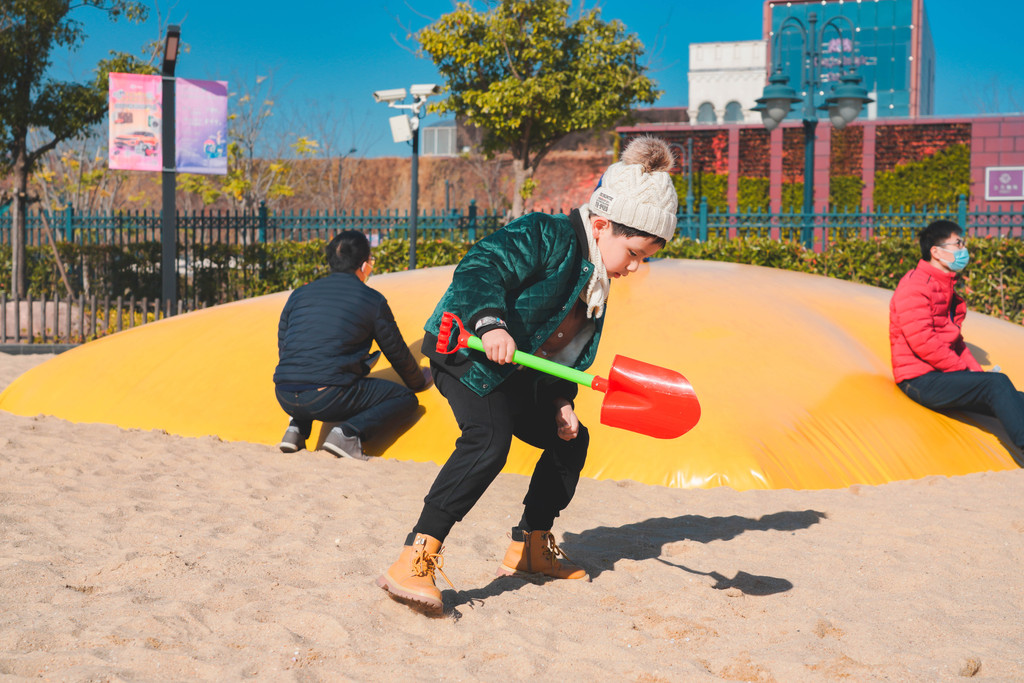 挖沙寻宝是考验小朋友眼力、手力以及英文水平的小活动,元宝在沙池里找到了“APPLE”五个字母,领到了一个苹果模型,每天早上都会重新撒字母进去的,所以趁早去收集哦。