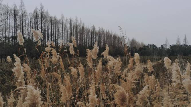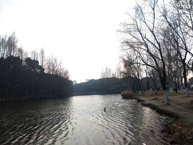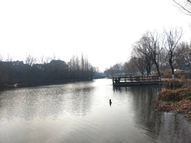 1月份的上海天气也冷了,湖面上有很多落叶。