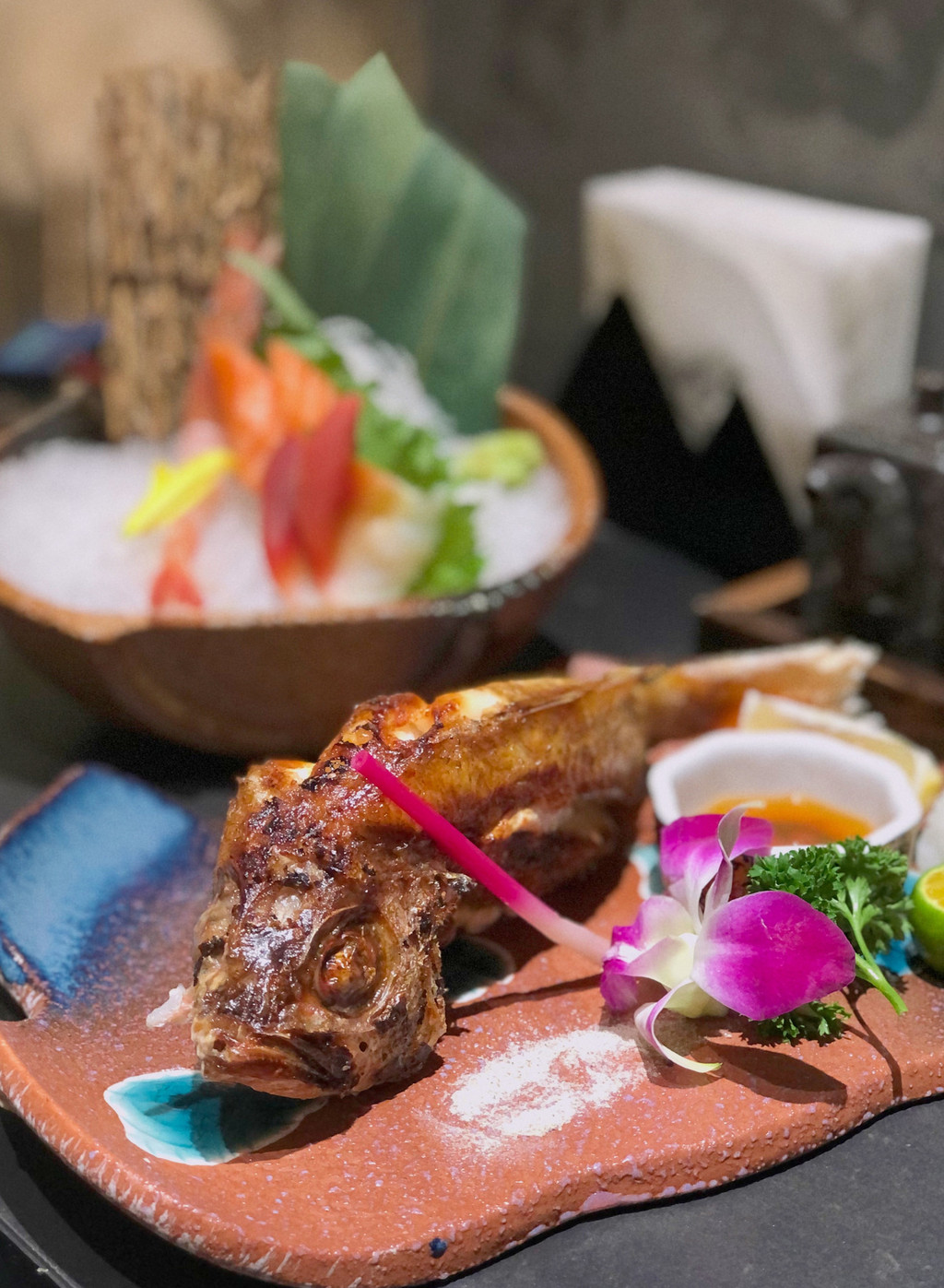 #烤喉黑#用高温瞬间锁住喉黑鱼滋味,仅以少许海盐调味,将食材与生俱来的滋味直接呈现,挤出几滴柠檬汁蘸着吃,入口即可感受远方海风迎面拂来,鱼皮烤得特脆口,又不会太干,鱼肉嫩而鲜美,淡淡的柠檬酸,让人回味无穷。这就是典型的炉端烧吃法,清甜的海鲜,少许的海盐,味蕾已在深海。