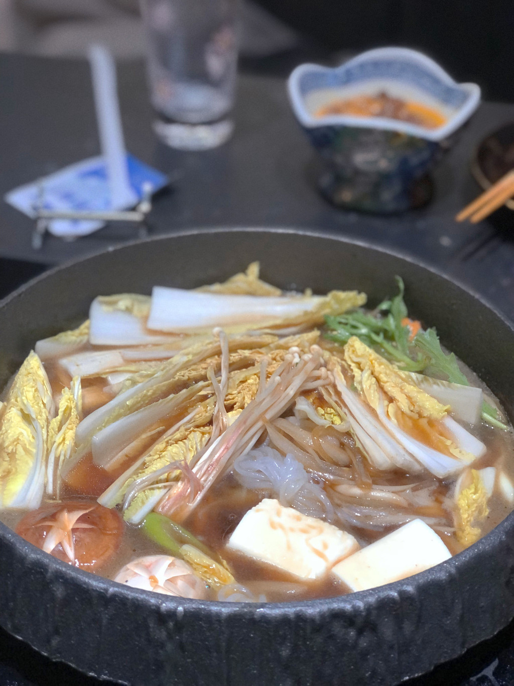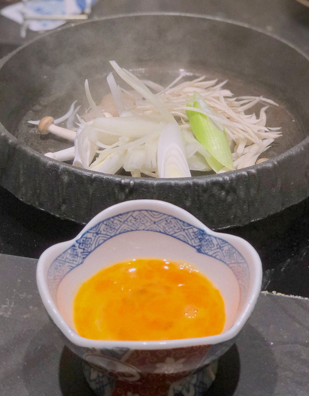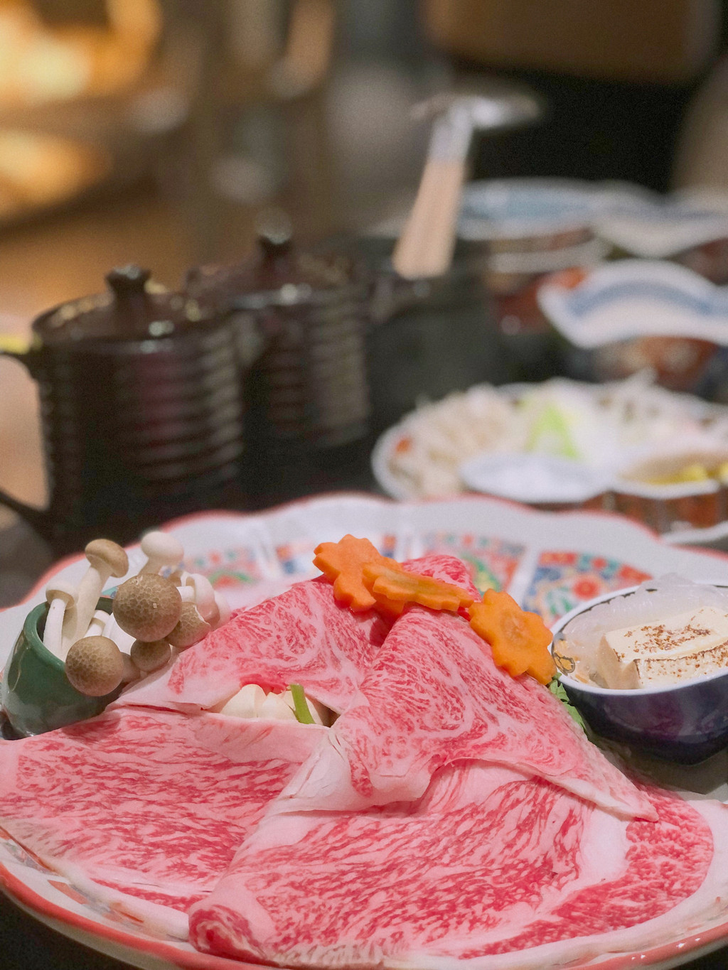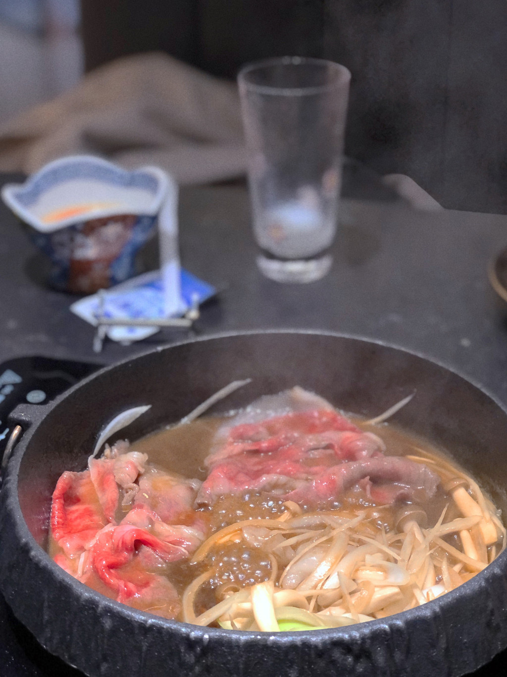 #M5上脑锅#由服务员先用牛油润锅后放入洋葱煎烤,香气宜人溢出,再放牛肉下锅铺平再淋上特调的寿喜汁,熟了以后夹起滚烫牛肉片蘸在打匀的生鸡蛋里一下马上入口,滑滑的口感和牛肉的香味让肉食控陶醉不已,把持不住了,吃完牛肉再把菌类、蔬菜、豆腐等等按顺序放进去煮起来,一锅香气四溢的煮物在咕咕嘟嘟沸腾的汤中翻滚着,满满渗出诱人的食材香气,再配上一杯美酒,简直是无与伦比的享受。