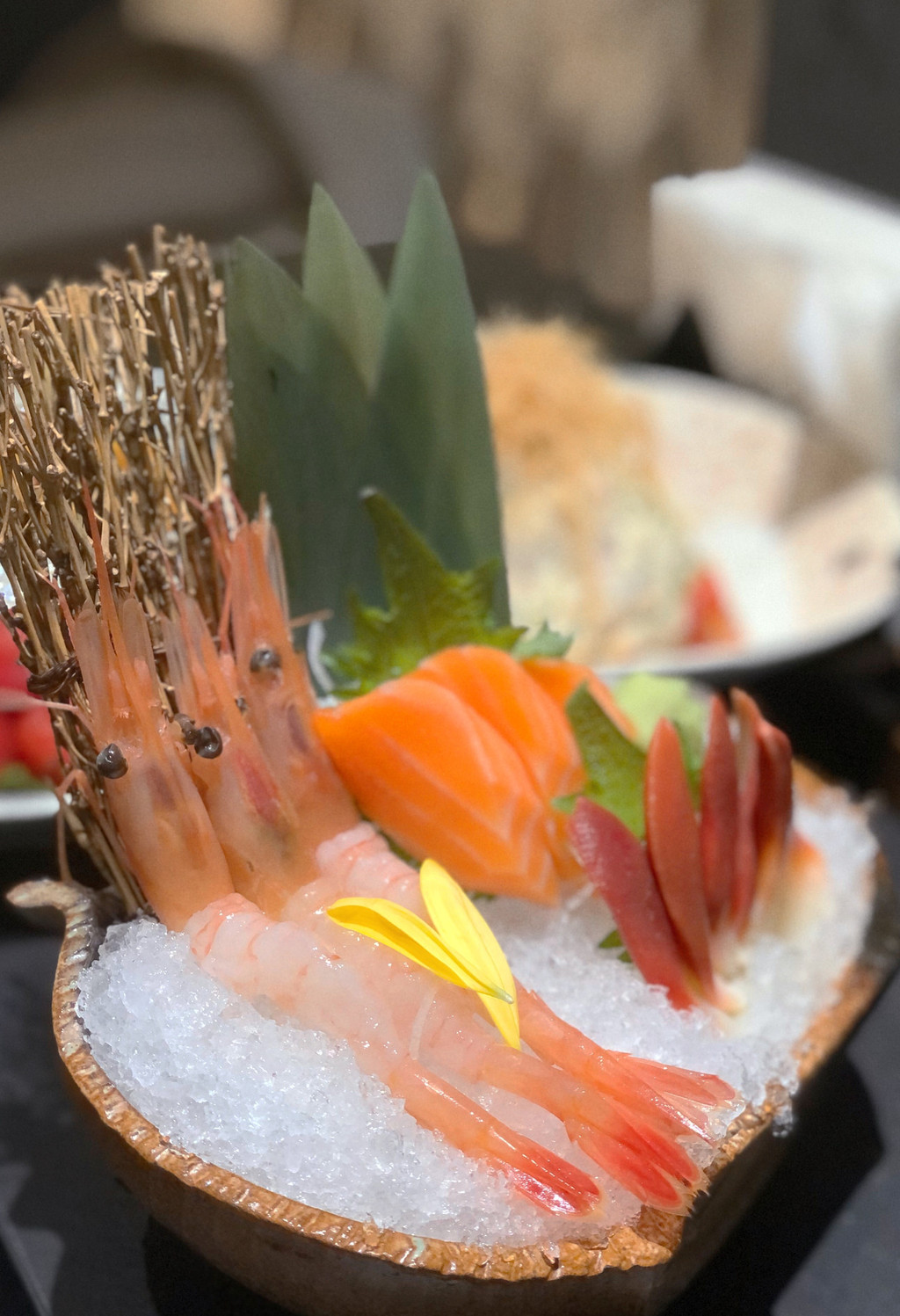 #刺身三拼#由甜虾、三文鱼、北极贝组成。裹一圈芥末酱油,再入口,一点都不腥,口感冰爽紧致而富有弹性,带点鲜美的甜,超级满足。