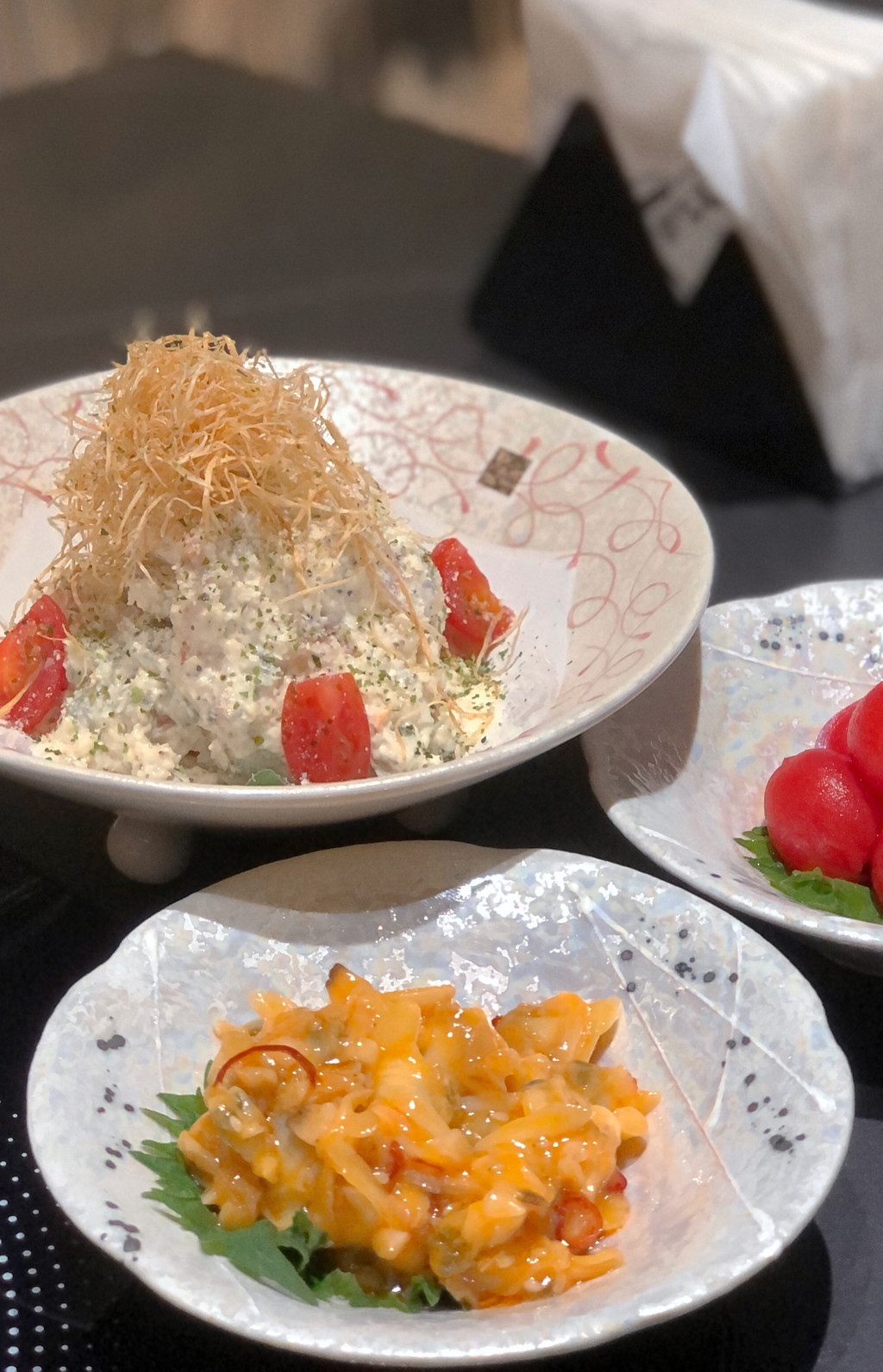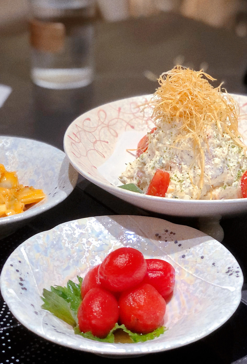 前菜#麻辣鲜蛤、红酒圣女果、厚培根土豆泥色拉#一丝丝的辣使得蛤蜊的鲜味更加显得淋漓尽致。色泽艳丽的圣女果带点淡淡红酒香,凉凉的微甜。当培根与土豆泥相遇,土豆刚好中和了培根的油腻,一口下去绵软的土豆泥在厚实的肉中沉醉。