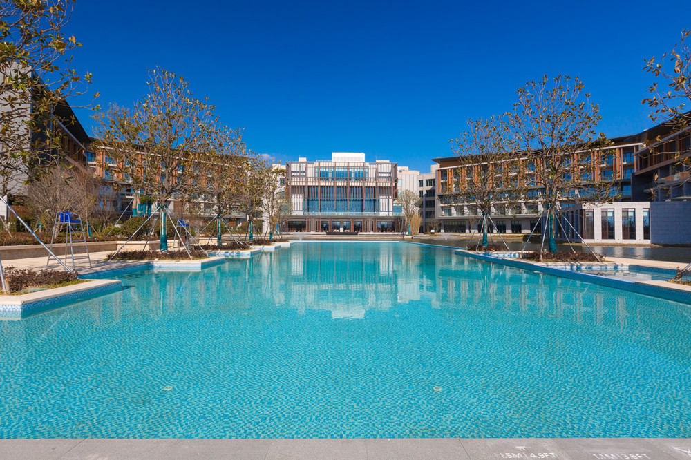落座于镜面池里的下沉式休憩区,近处有被半包围在两翼客房间的内湖和户外泳池,远处是青翠的婚礼草坪和生态园的昂扬绿意。