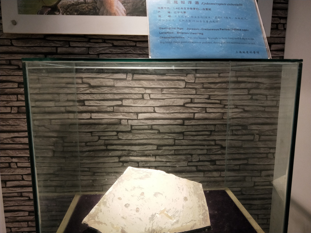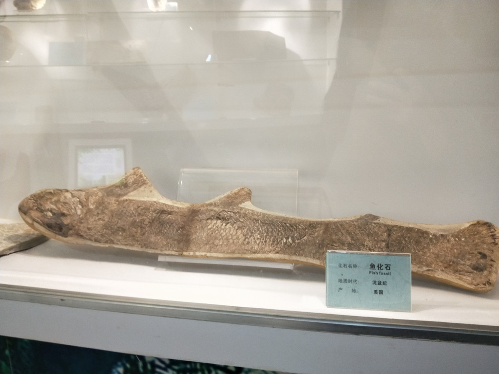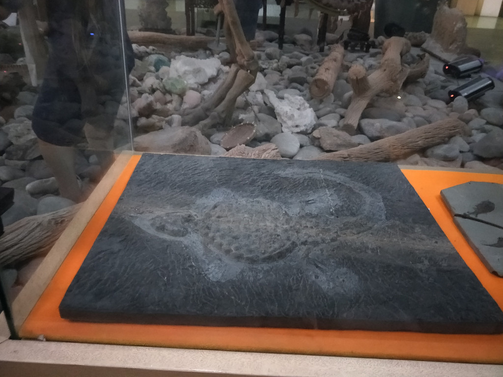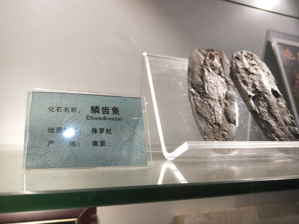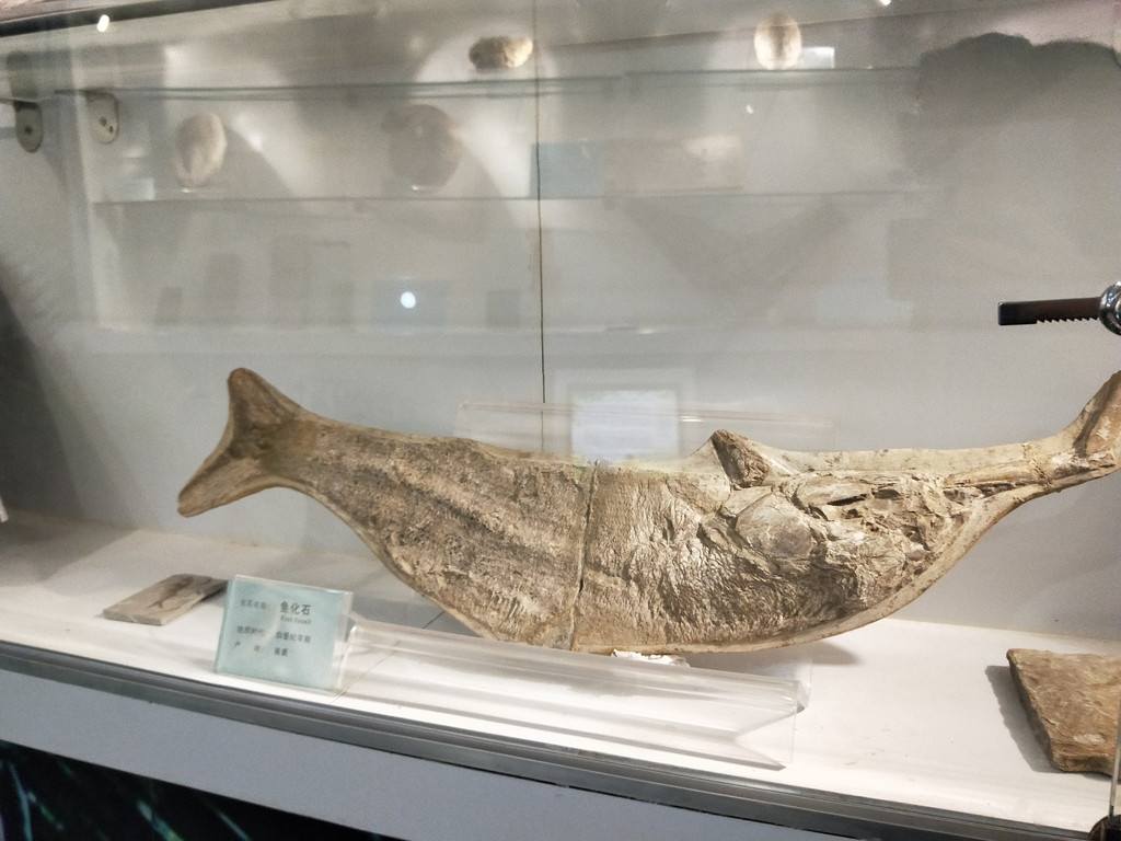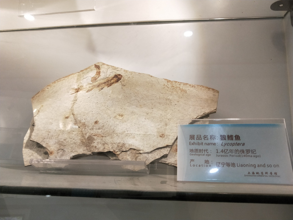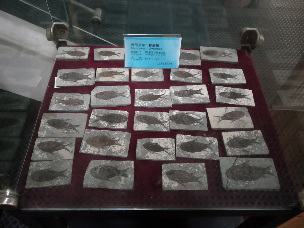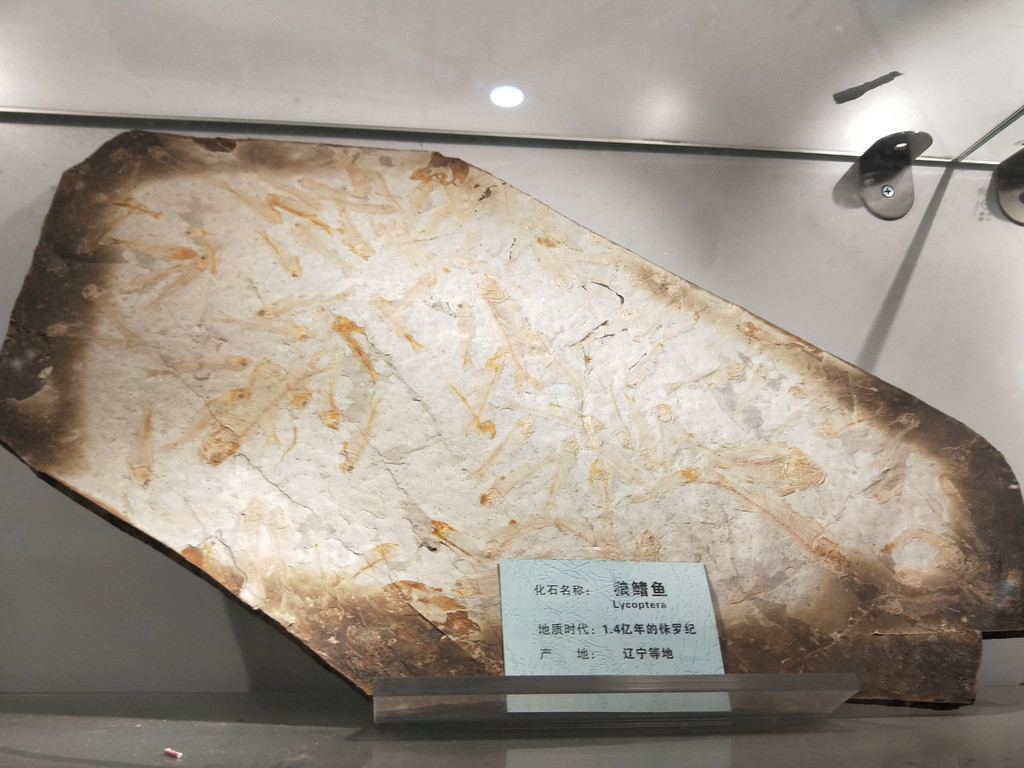 骨唇鱼生活在始新世,换算成时间距离的话,大约在距今约四千万年前,是真骨鱼次纲骨唇鱼属的一种鱼类,在分类上属于鲤鱼科,它的形状呈纺锤形,倒是确实有点像我们今天的鲤鱼的。化石在展柜里排列了五行五列,只有最后一行少了一条,加起来足足有二十九条骨唇鱼化石,以至于我以为这种鱼类的化石很普通,其实也是属于比较珍稀的一种化石,只不过东方地质科普馆的资源比较丰富而已。