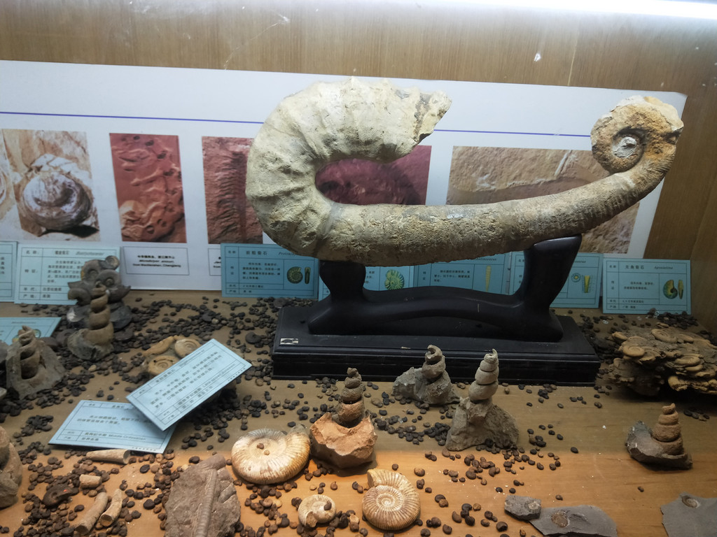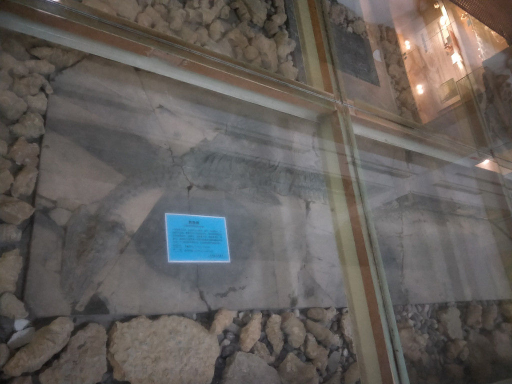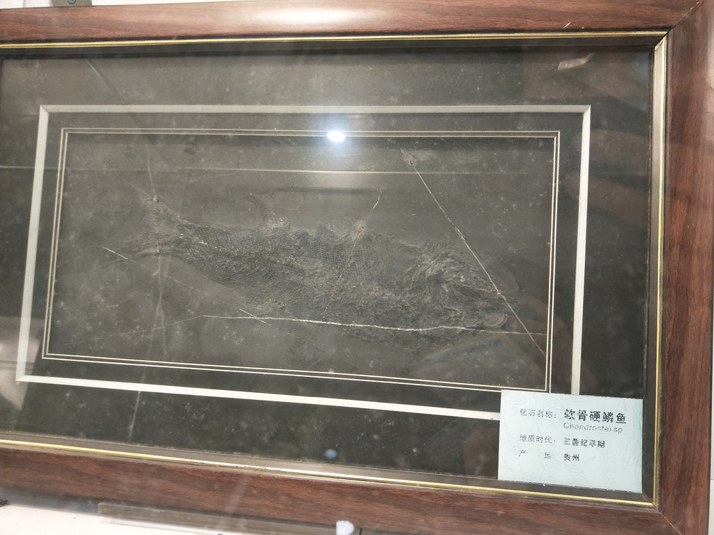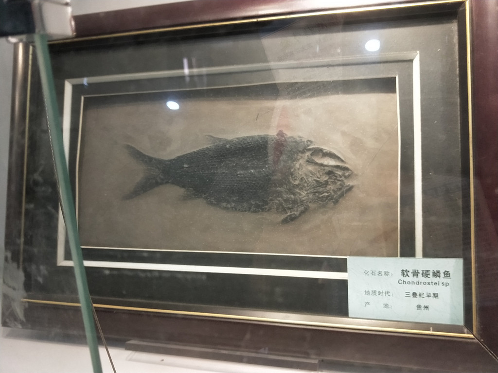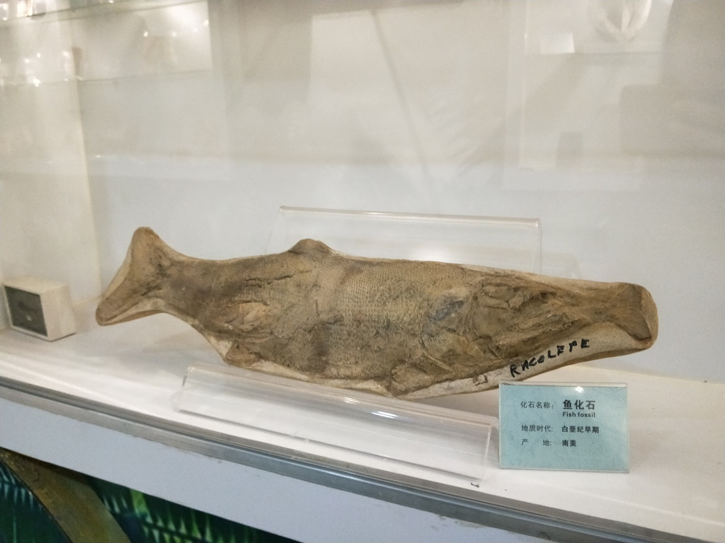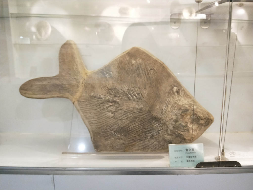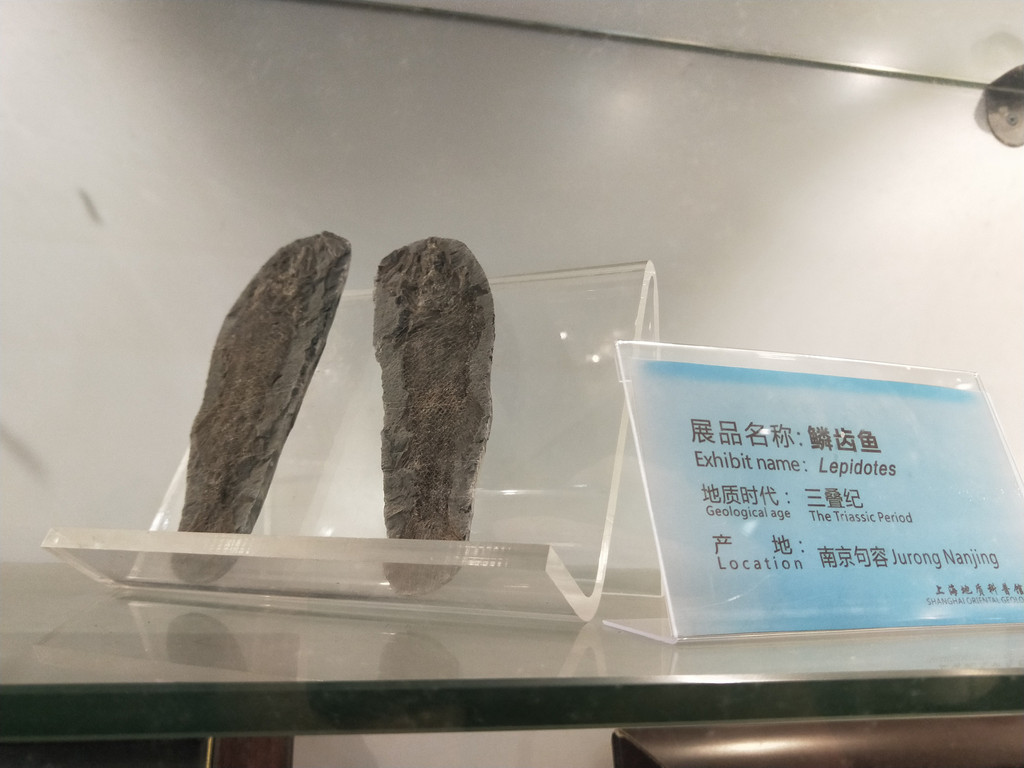 骨唇鱼生活在始新世,换算成时间距离的话,大约在距今约四千万年前,是真骨鱼次纲骨唇鱼属的一种鱼类,在分类上属于鲤鱼科,它的形状呈纺锤形,倒是确实有点像我们今天的鲤鱼的。化石在展柜里排列了五行五列,只有最后一行少了一条,加起来足足有二十九条骨唇鱼化石,以至于我以为这种鱼类的化石很普通,其实也是属于比较珍稀的一种化石,只不过东方地质科普馆的资源比较丰富而已。