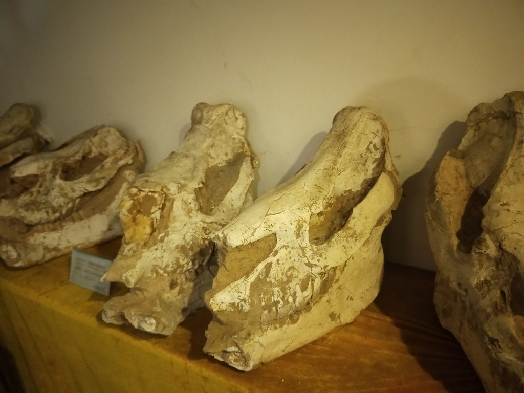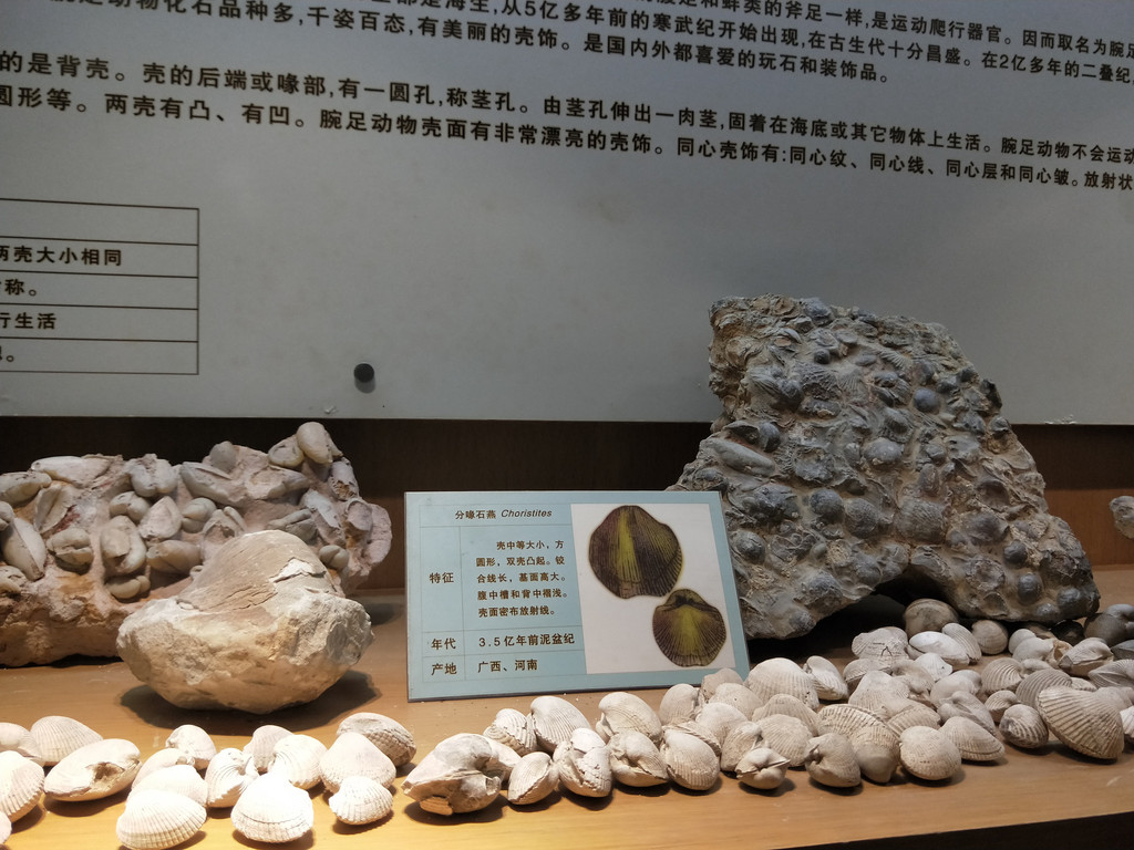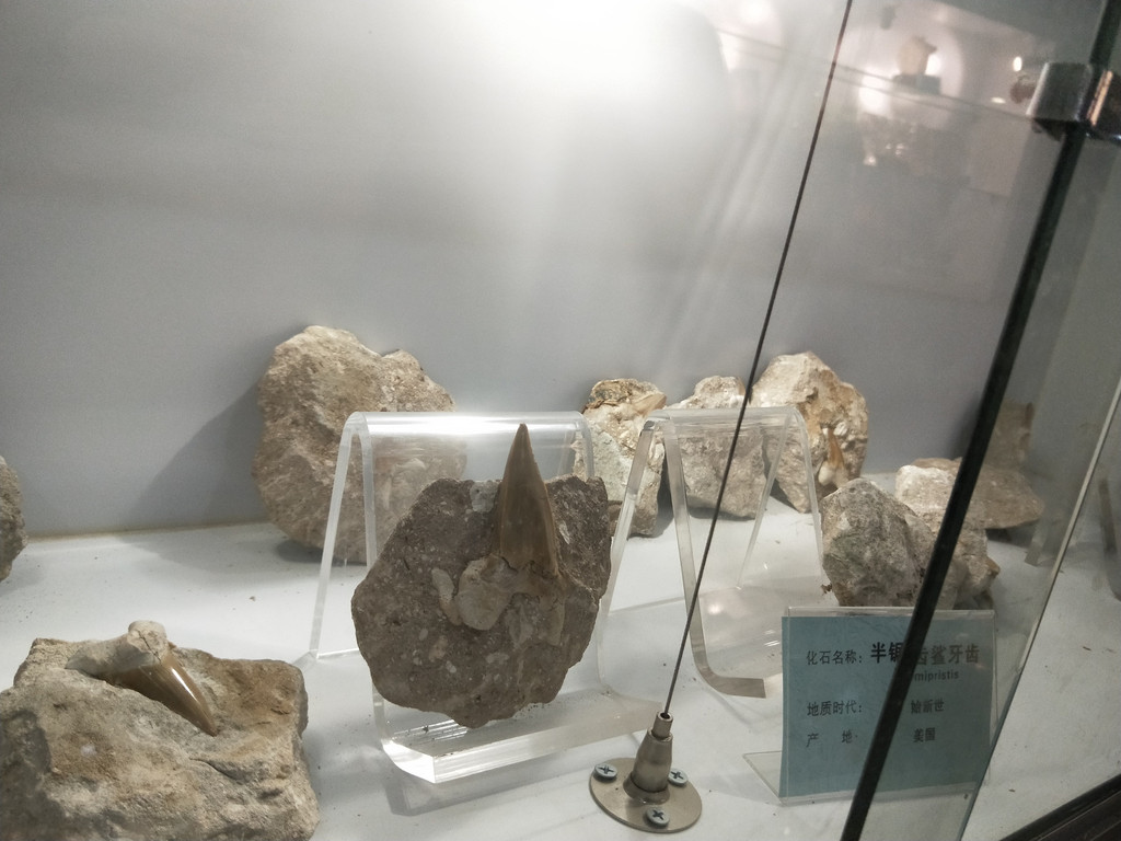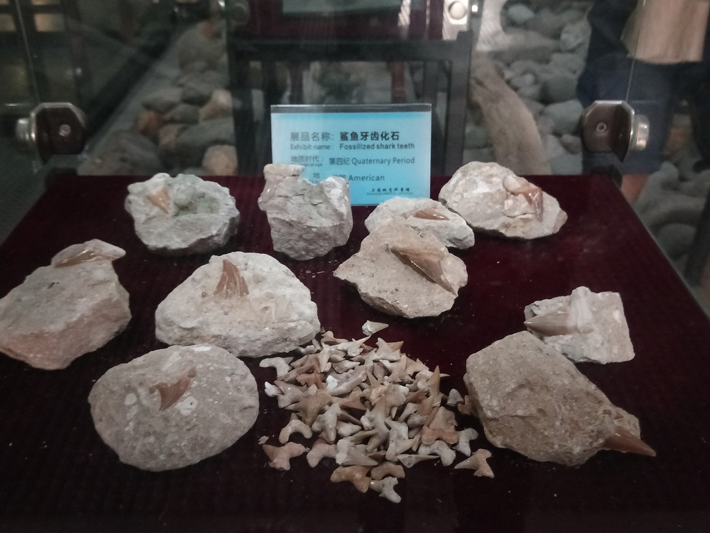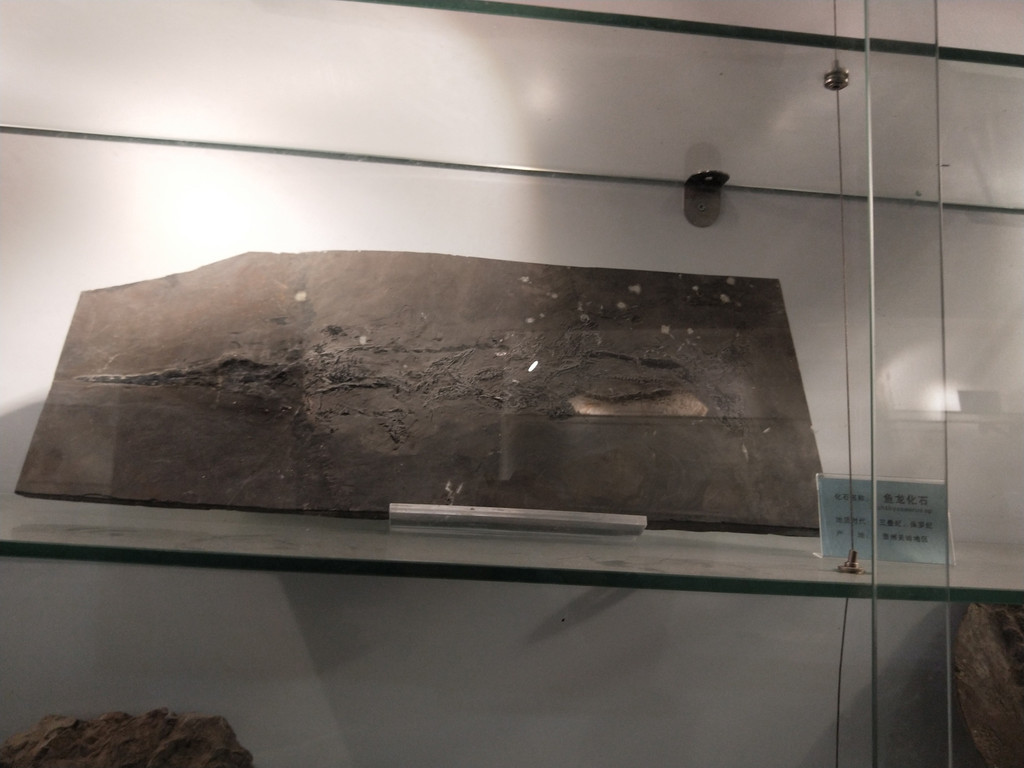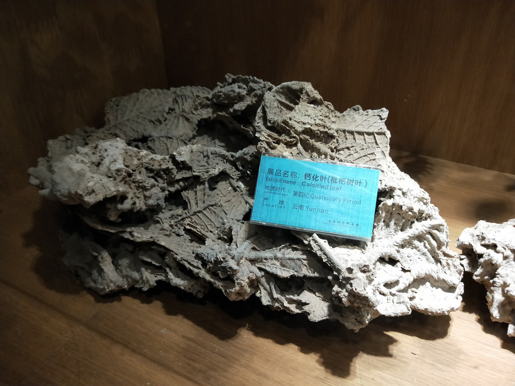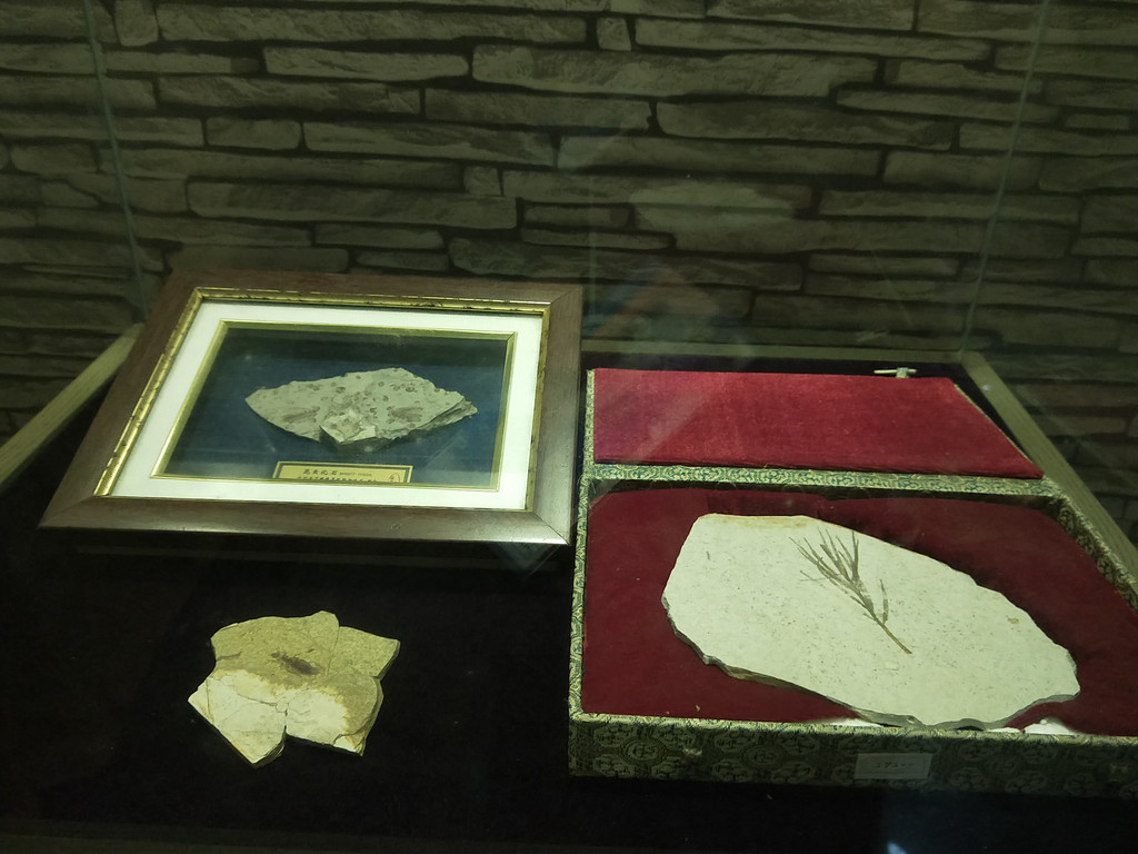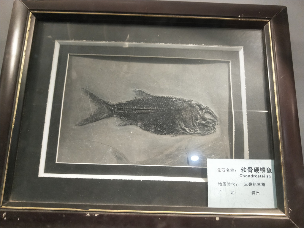 骨唇鱼生活在始新世,换算成时间距离的话,大约在距今约四千万年前,是真骨鱼次纲骨唇鱼属的一种鱼类,在分类上属于鲤鱼科,它的形状呈纺锤形,倒是确实有点像我们今天的鲤鱼的。化石在展柜里排列了五行五列,只有最后一行少了一条,加起来足足有二十九条骨唇鱼化石,以至于我以为这种鱼类的化石很普通,其实也是属于比较珍稀的一种化石,只不过东方地质科普馆的资源比较丰富而已。