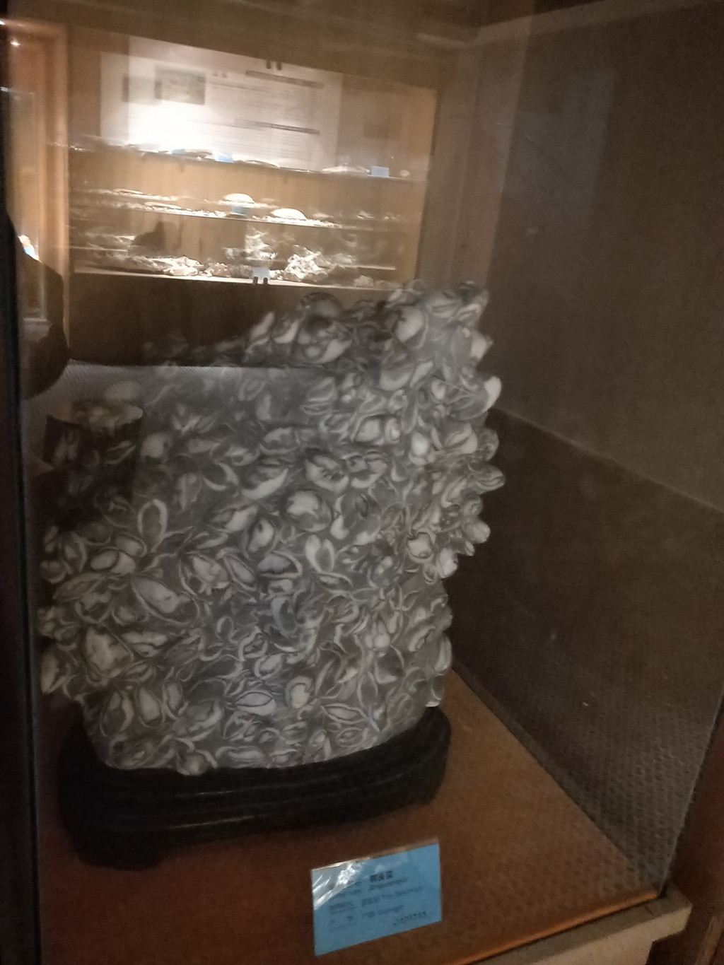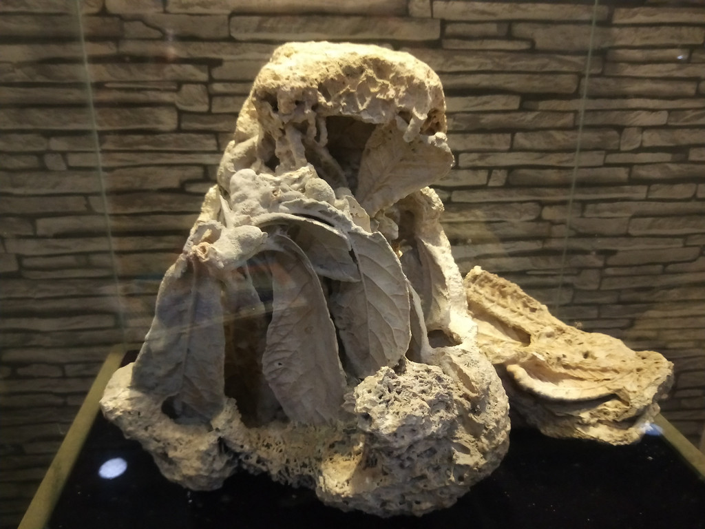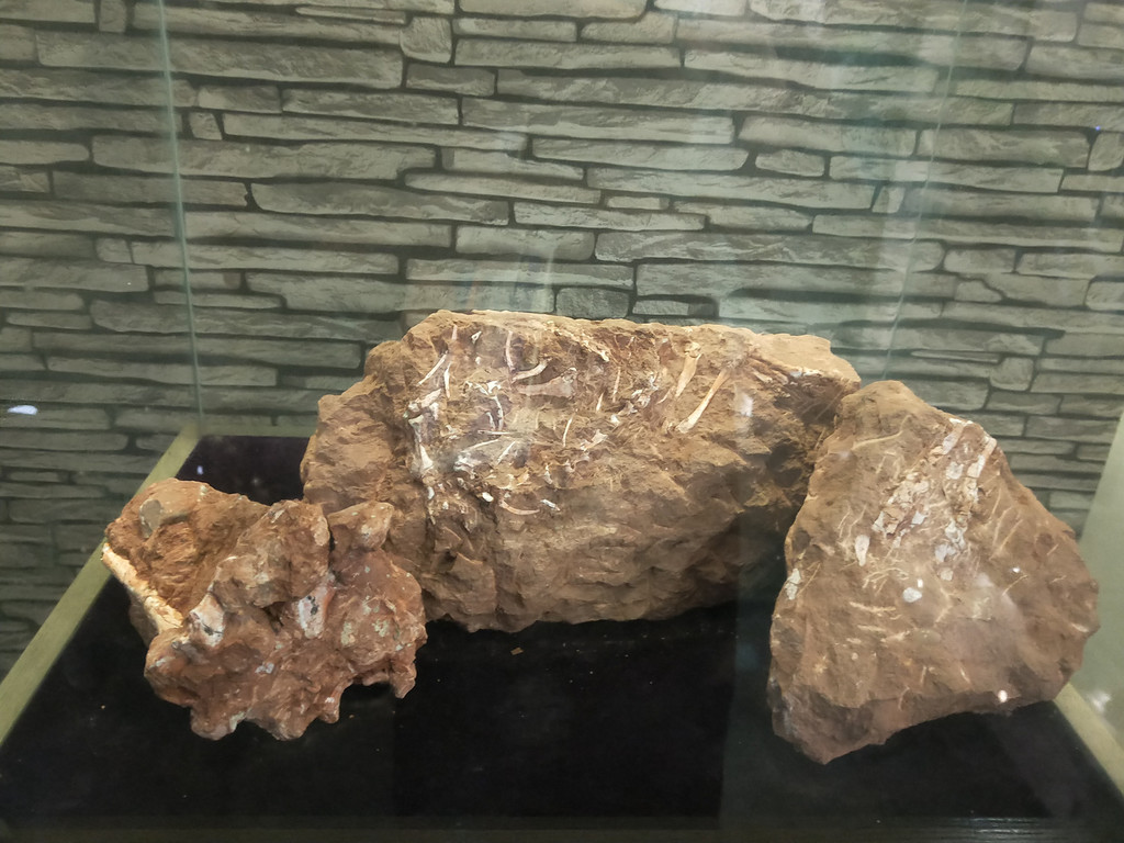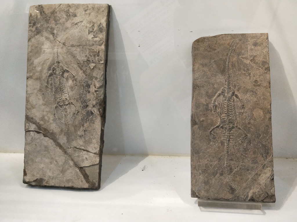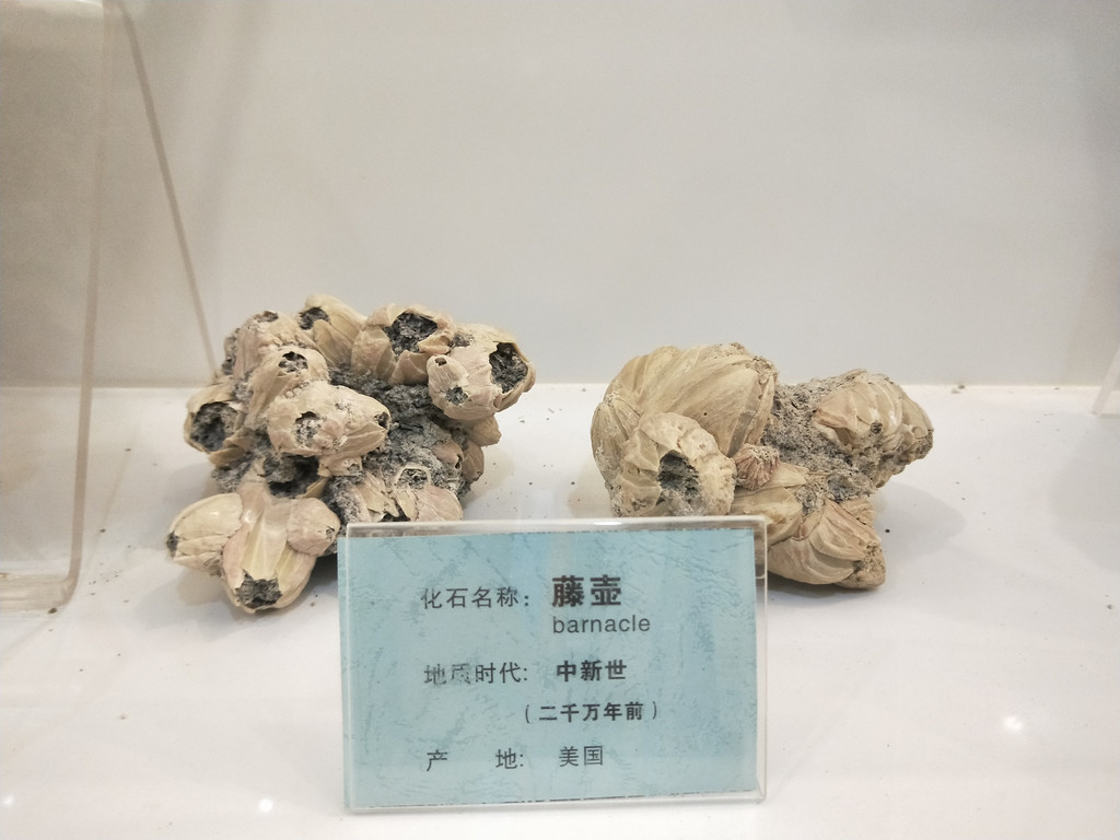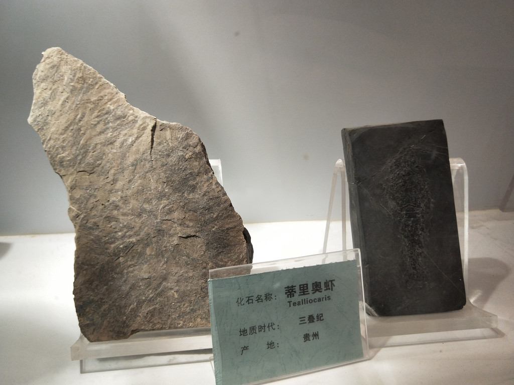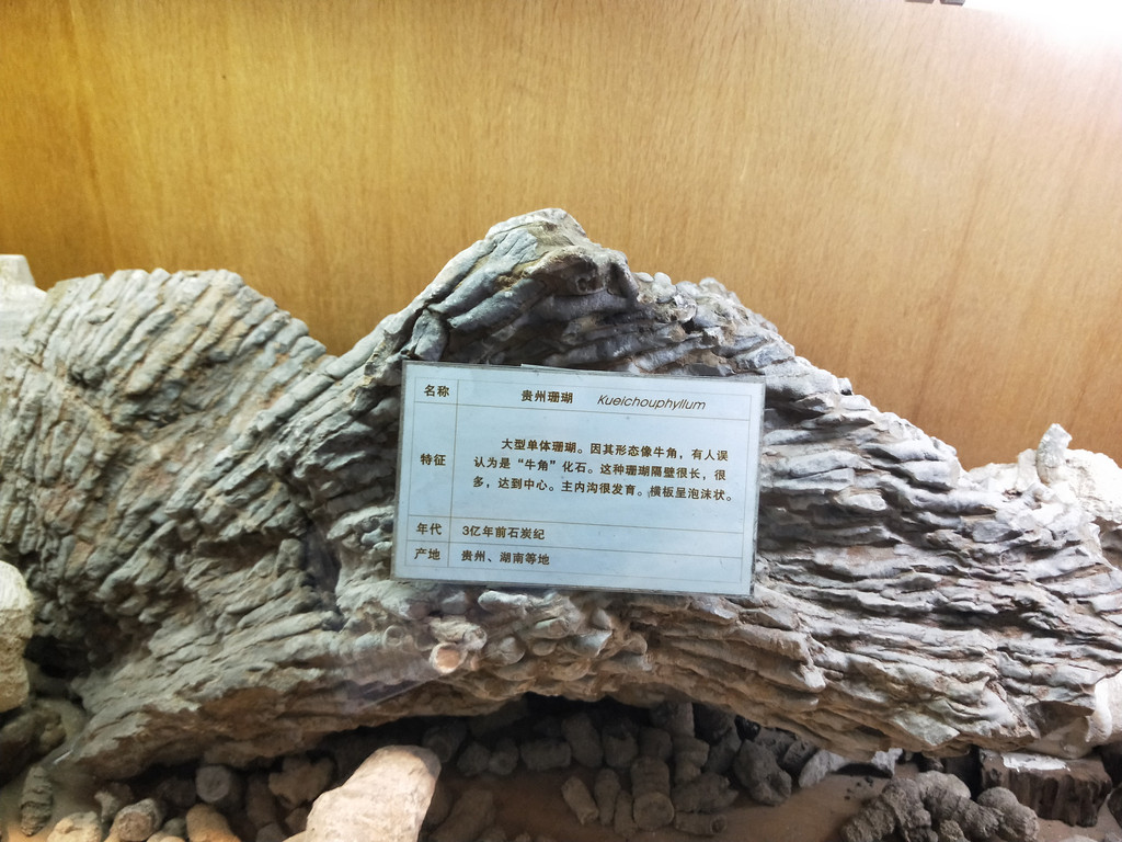 骨唇鱼生活在始新世,换算成时间距离的话,大约在距今约四千万年前,是真骨鱼次纲骨唇鱼属的一种鱼类,在分类上属于鲤鱼科,它的形状呈纺锤形,倒是确实有点像我们今天的鲤鱼的。化石在展柜里排列了五行五列,只有最后一行少了一条,加起来足足有二十九条骨唇鱼化石,以至于我以为这种鱼类的化石很普通,其实也是属于比较珍稀的一种化石,只不过东方地质科普馆的资源比较丰富而已。