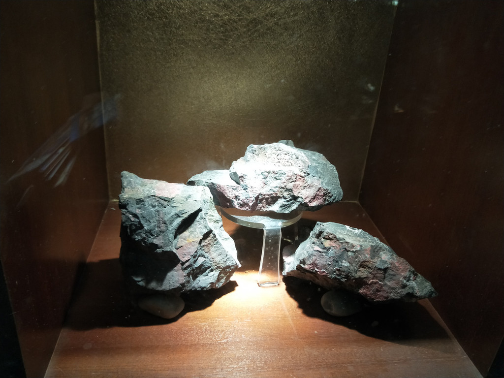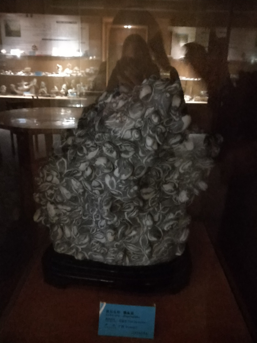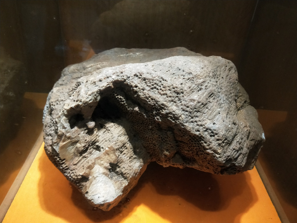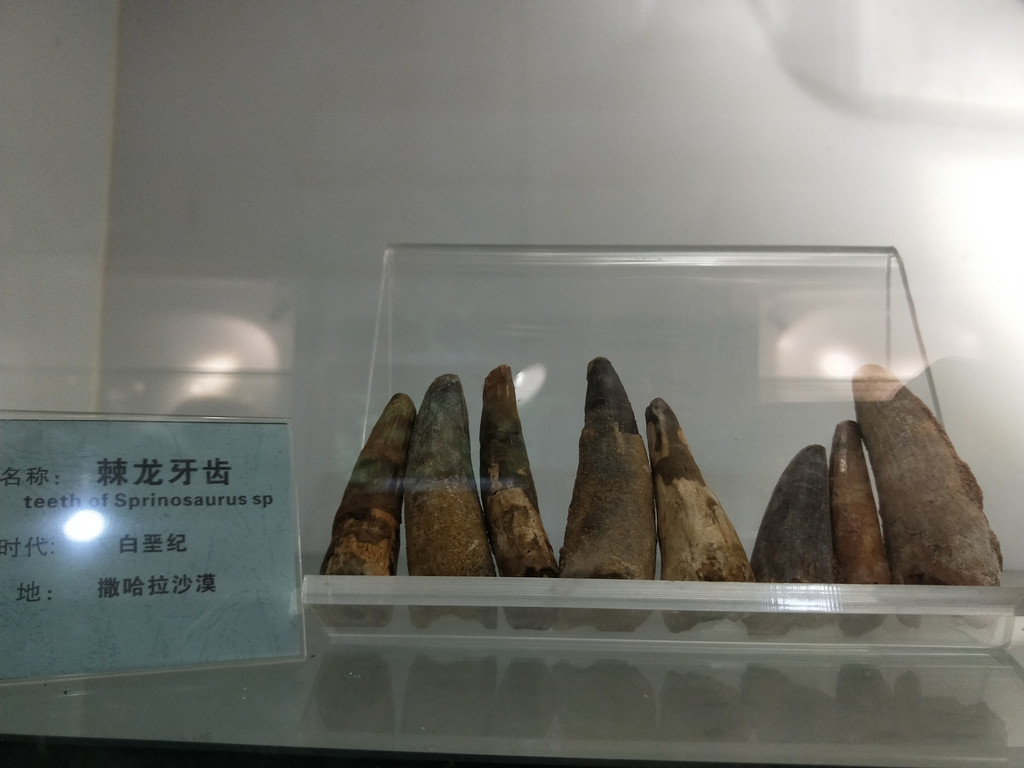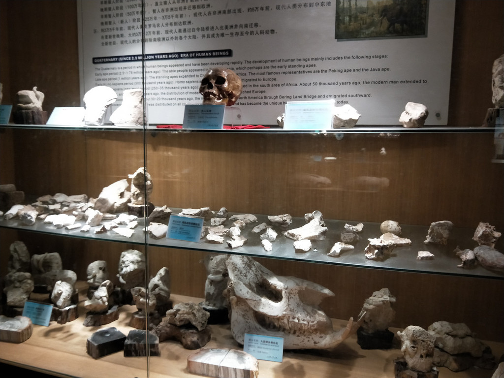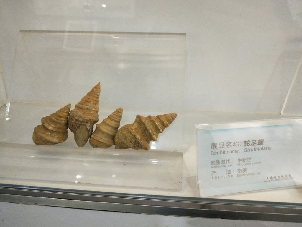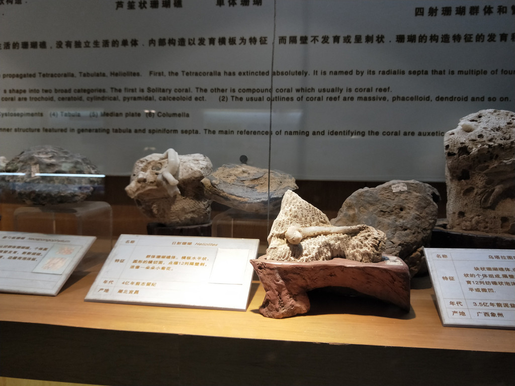 骨唇鱼生活在始新世,换算成时间距离的话,大约在距今约四千万年前,是真骨鱼次纲骨唇鱼属的一种鱼类,在分类上属于鲤鱼科,它的形状呈纺锤形,倒是确实有点像我们今天的鲤鱼的。化石在展柜里排列了五行五列,只有最后一行少了一条,加起来足足有二十九条骨唇鱼化石,以至于我以为这种鱼类的化石很普通,其实也是属于比较珍稀的一种化石,只不过东方地质科普馆的资源比较丰富而已。