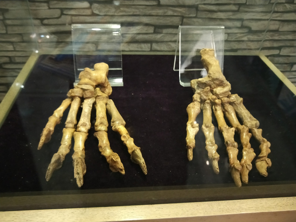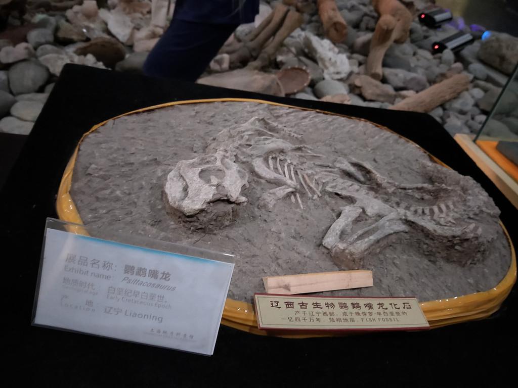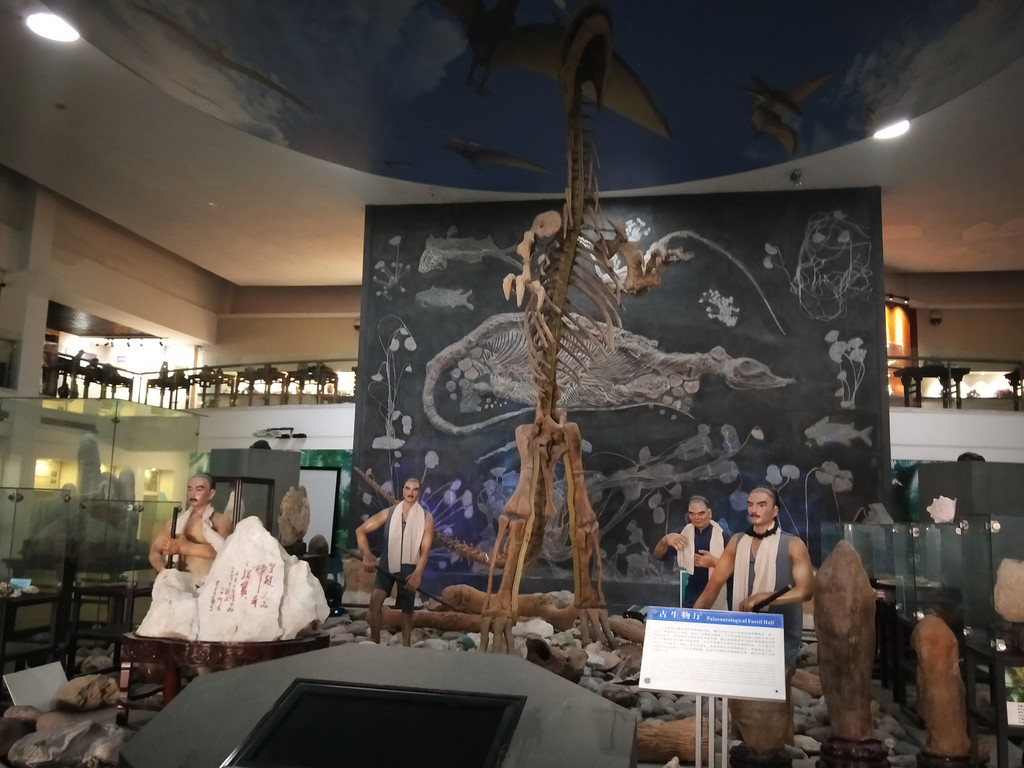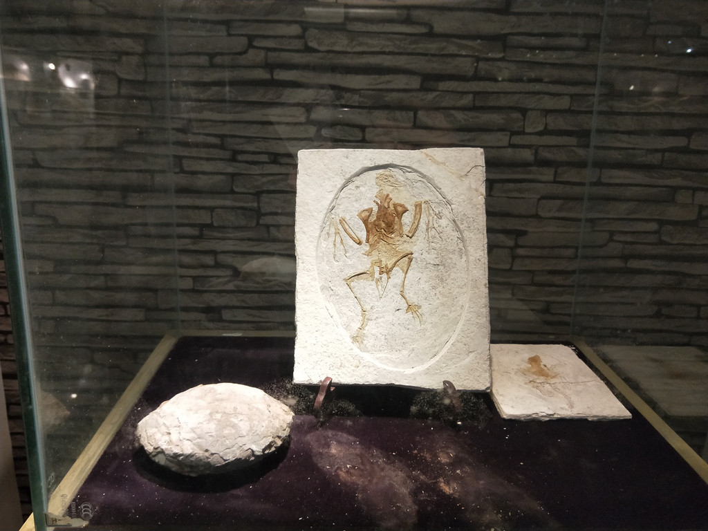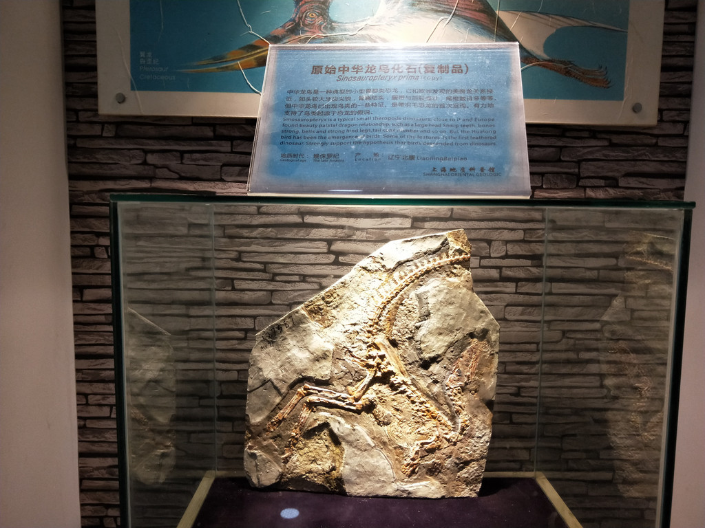 中华龙鸟化石是复制品,大约这种化石弥足珍贵。它的名字里既有“龙”字又有“鸟”字,让人很疑惑它到底是恐龙还是鸟类。这样的争议在化石刚发现的时候,引起了很大的热议,真是公说公的理婆说婆的理。后来经过了科学的手段,确定中华龙鸟是一种小型兽脚类恐龙,是美颌龙的一种。根据复原图来看,它们没有翅膀这种构造。至于身上的羽毛,有的认为它可能只是一种表明性别的“装饰物”,还有的人认为是一种保温装置。如果后者的结论成立的话,那就表明像中华龙鸟这类的小型恐龙,很有可能是温血动物,甚至可能是恒温动物。