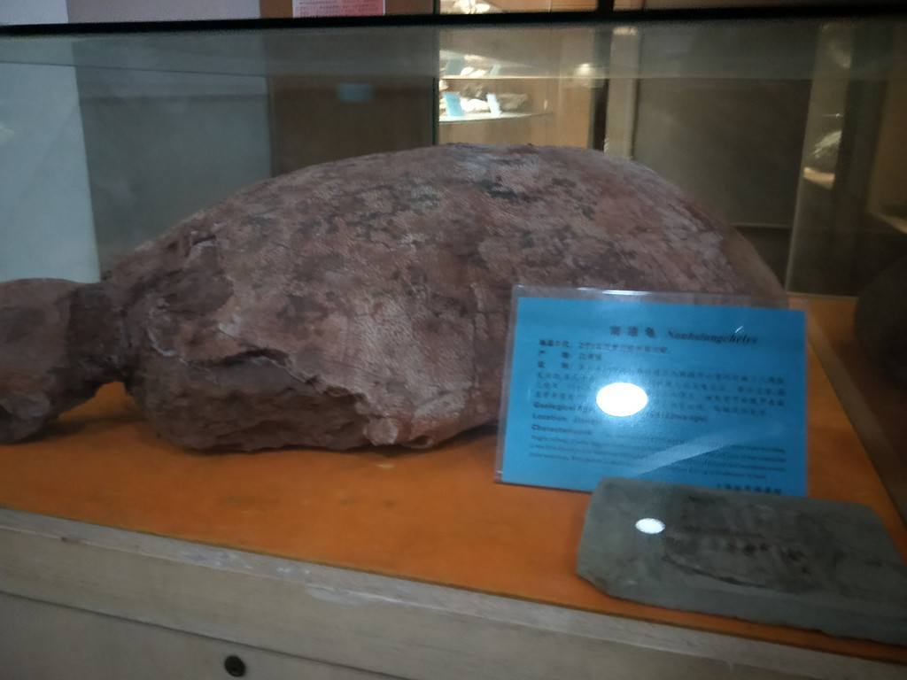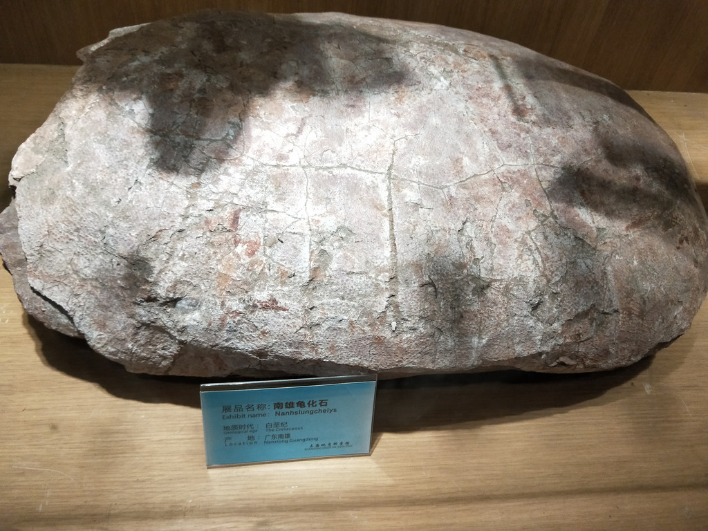 南雄龟化石只是龟背,这种龟的体形巨大,最大的特点是骨板有网状的纹饰,生活在白垩纪时期,因为在南雄出土,所以古生物界命名为“南雄龟”。