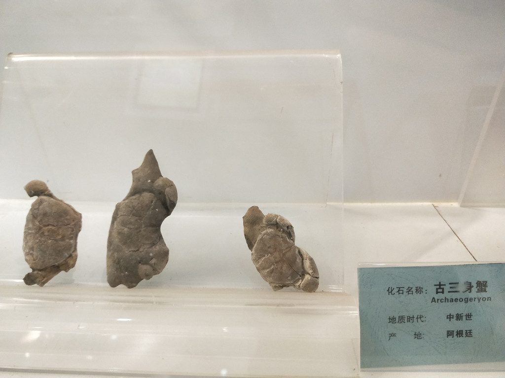 古三身蟹产自阿根廷,生活在中新世,甲壳近六边形,粗壮的螯足大小不同,步足很强壮,但是第五附肢比较细,呈扁平状态,看样子是专门用来游泳的。
