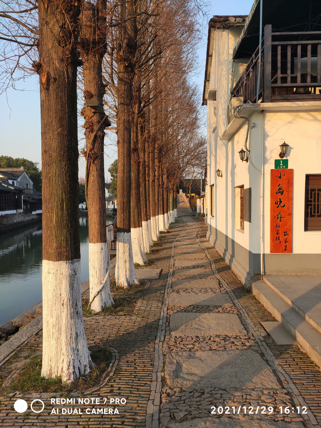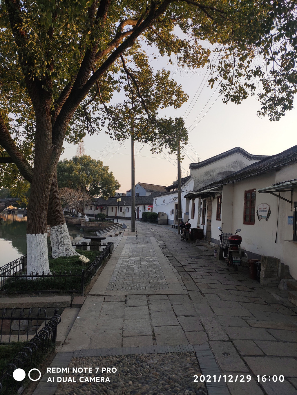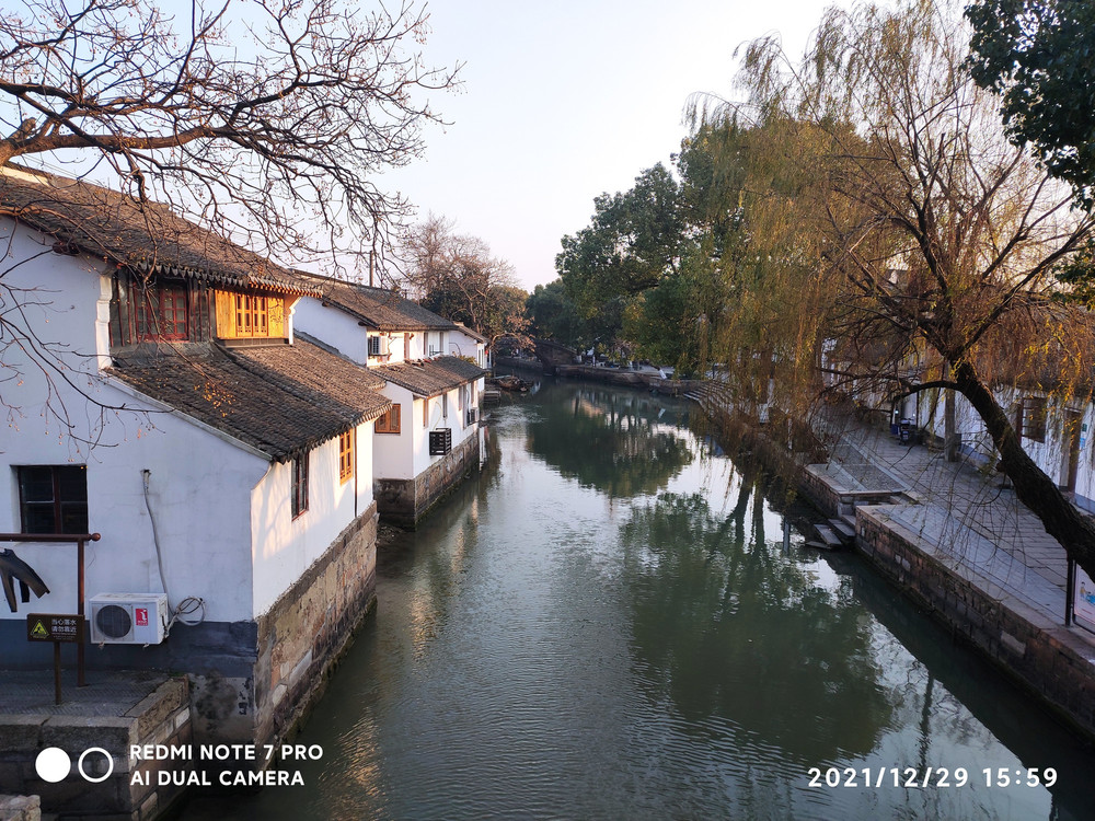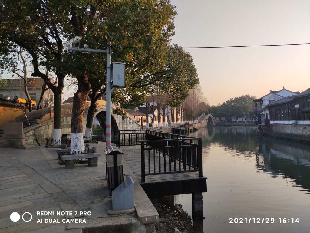 古镇街面整洁,青石板在夕阳的照射下光亮、古朴,古河道清澈。