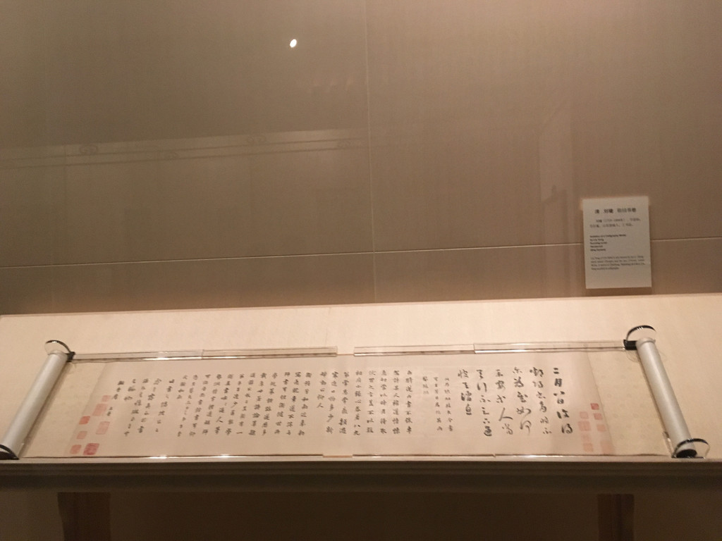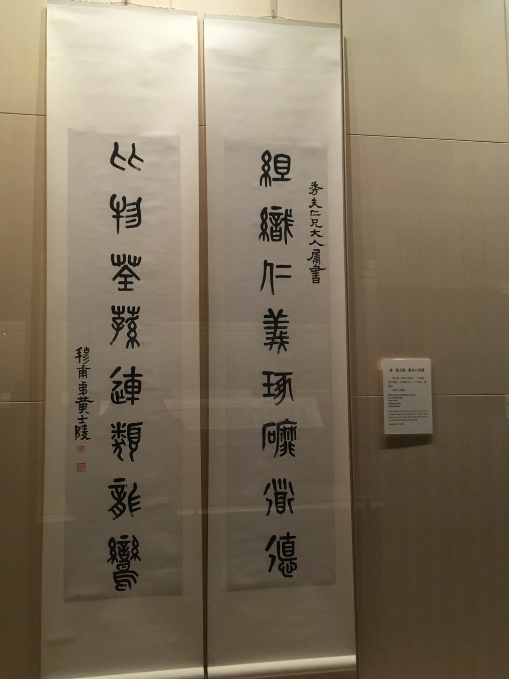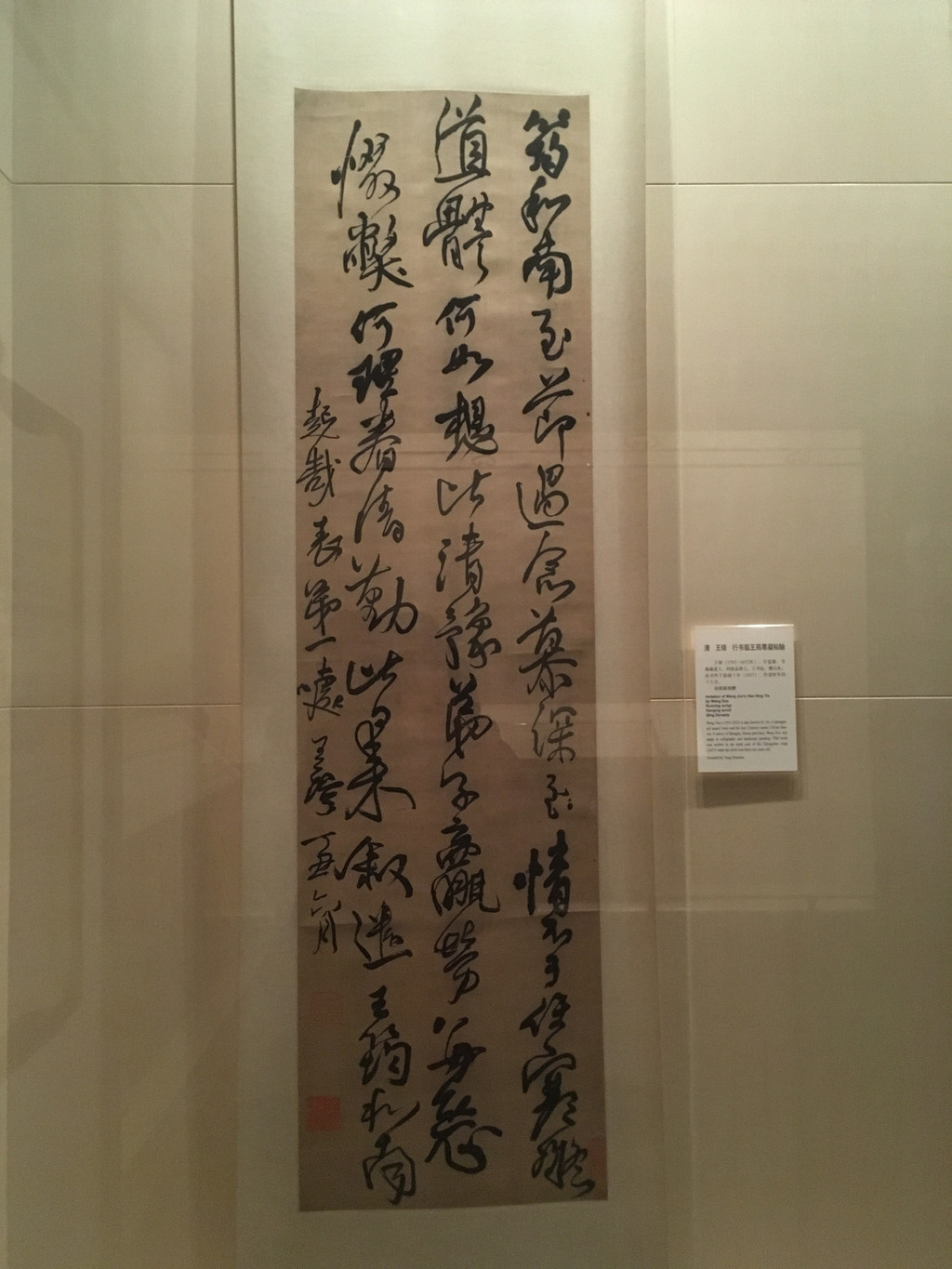 我们估摸了一下时间,就看了看王铎的行书竖轴,还有刘墉、黄士陵和吴大澂的书法作品,就前往下一个展厅去了。